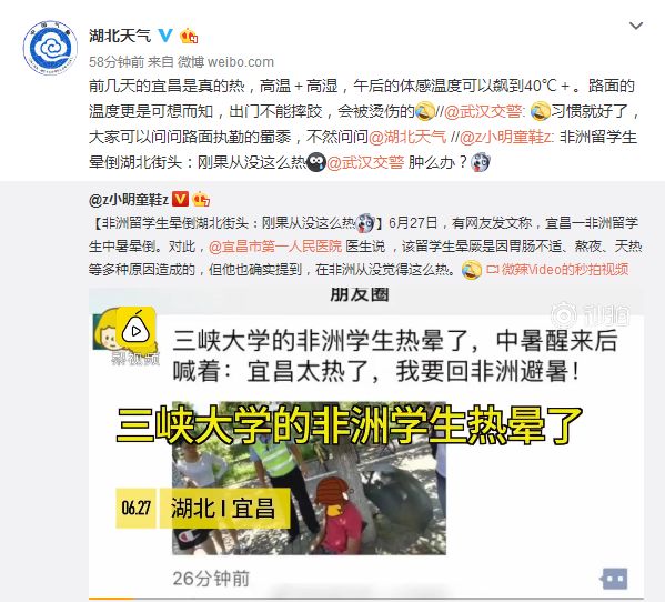 近期湖北宜昌高温,一张非洲留学生晕倒的照片刷爆朋友圈。医务人员表示,由于其近期饮食不规律,再加上高温、熬夜,导致晕厥,并不能表明宜昌比非洲热。