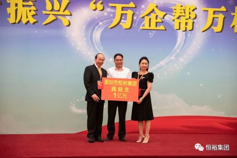 副省长叶贞琴(中)与恒裕集团董事局主席龚俊龙(左)、夫人林婵娟(右)合影留念 2018广东扶贫济困日活动,恒裕集团董事局主席龚俊龙再次向广东省慈善总会捐赠1亿元人民币,用于帮扶省内贫困村、支持贫困人口脱贫奔康。 这是至2010年“广东扶贫济困日”活动成立以来,恒裕集团连续9年参加“广东扶贫济困日”活动,其中,2016-2018年连续三年,每年捐赠1亿元支持广东扶贫济困,截至目前,恒裕集团已累计为社会捐款超过15亿元。
