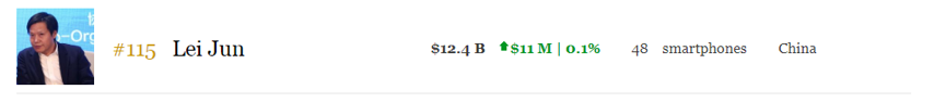 截至港股收盘,雷军位居福布斯实时富豪榜115名,个人财富累积124亿美元,逼近第98位百度李彦宏的140亿美元。