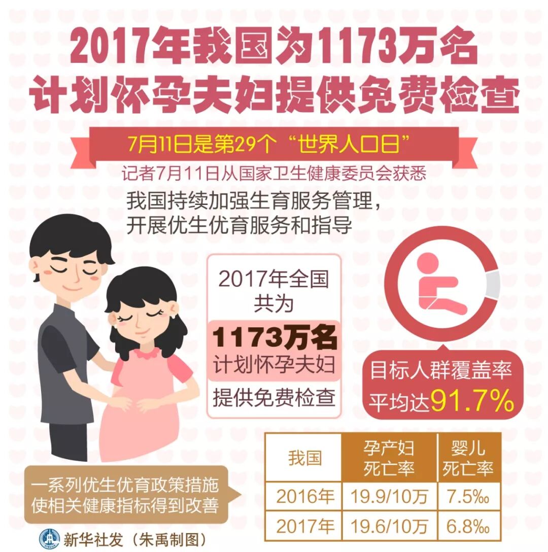 据国家卫生健康委员会消息,2017年全国共为1173万名计划怀孕夫妇提供免费检查,目标人群覆盖率平均达91.7%。