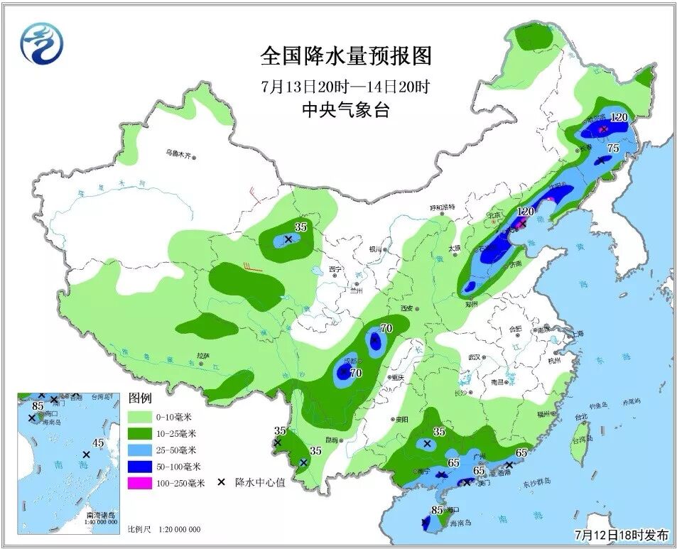 7月13日20时至14日20时,华北地区东部、东北地区中南部、四川盆地西北部、华南中南部等地有大雨或暴雨,其中河北东北部、辽宁南部、黑龙江南部等地局地有大暴雨。