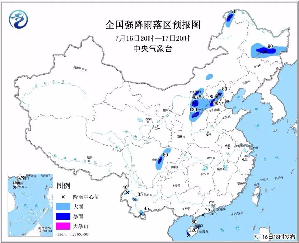 7月16日20时至17日20时,山西中北部、河北中部、北京、内蒙古中部和东北部、黑龙江南部以及四川盆地西部、广东西部沿海、海南岛等地的部分地区有大到暴雨,局地大暴雨(100-130毫米),上述局部地区将伴有短时强降水和雷暴等强对流天气,最大小时降水量30-50毫米,局地70毫米以上。