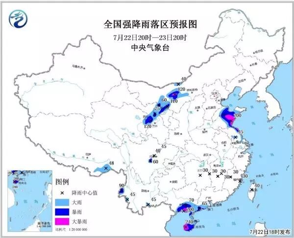 中央气象台继续发布暴雨黄色预警:7月22日20时至23日20时,江苏东部、山东中东部、海南岛、广西南部、广东西南部等地有大到暴雨,其中江苏东北部、山东中部和东南部、海南岛西部、广西南部沿海等地的部分地区有大暴雨(100~240毫米)。