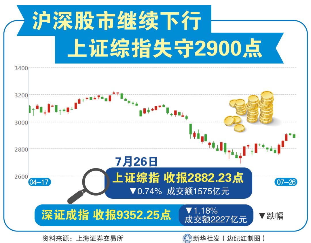 26日A股继续下行。上证综指失守2900点整数位,深市三大股指同步录得逾1%的跌幅。两市成交继续萎缩,总量降至3800亿元附近。