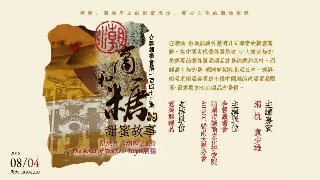 8月4日(即本周六)上午,潮商文化研究院联合合胜读书会,推出潮汕映像系列NO.1“潮商和糖的甜蜜故事”。活动除了现场播放纪录片《潮糖之路》的精华片段,还将邀请影片的主创人员雨杭、袁少雄与大家分享台前幕后的故事以及影片背后的历史脉络和潮汕人文。值得一提的是,由于届时现场观众中将会有外国留学生,这一期读书会将采用中文和英文双语讲解,现场展播的纪录片也将有中英文双字幕。潮式粿品制作技艺第五代市级传承人郑冠虹将与大家分享“潮汕美食中糖的印记”,并带来潮汕特色甜点给现场观众品尝。