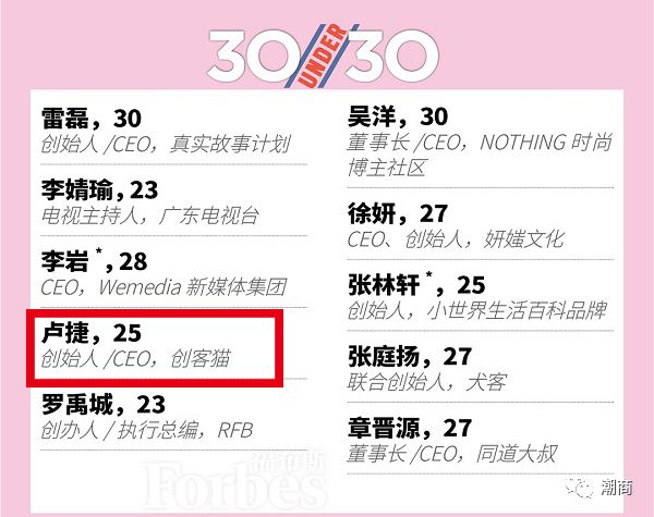提示:点击上方"潮商"关注我们 ![]() 8月2日,福布斯中国正式公布2018年中国“30位30岁以下精英”榜单(简称福布斯中国30 Under 30),来自潮汕的90后知名创业者——“创客猫”创始人卢捷入选媒体领域精英榜单! ![]() 入选部分榜单截图 ![]() 今年福布斯中国评选的20个领域包括娱乐、财务和金融、教育、风险投资、科学、零售与电商、旅游、媒体、能源环保等。榜单涵盖了各个领域的明星,“喜茶”创始人聂云宸等入选食品饮料行业精英榜单,围棋选手柯洁、游泳运动员孙杨、短道速滑运动员武大靖等入选体育行业精英榜单,其他领域入选的精英还包括在刚刚在《偶像练习生》中C位出道的流行男歌手蔡徐坤、流行男歌手黄子韬、毛不易,青年演员杨洋、黄景瑜、杨紫、刘昊然等。 福布斯中国总编Russell Flannery表示:“中国正处于创业的黄金时代。中国优秀年轻人创业的比重很高,他们普遍受到良好教育,比前辈更懂得拥抱技术、拥抱资本。希望30 Under 30榜单能展示这些值得关注的青年才俊。他们在增加社会工作机会、促进经济发展的同时,也正在改变中国经济生活,提高中国在全球的影响力。” ![]() 卢捷 入选2018福布斯中国“30位30岁以下精英”榜单的卢捷毕业于汕头市第四中学,90后知名创业者,厦门创客猫网络科技有限公司创始人、厦门创客猫联合团支部书记,曾获第十五届“福建青年五四奖章”、第七届“福建青年创业奖”、厦门市第十批高层次人才“双百计划”领军型创业人才、海峡导报“2017年度最具代表性的青年领袖”、中国“互联网+”大学生创新创业大赛全国银奖、第三届“创青春”福建省青年创新创业大赛一等奖等荣誉。 2015年7月,卢捷创办创业新媒体“创客猫”,目前已在厦门、北京、深圳、香港设立运营团队,已获得近千万融资,专访过包括IDG资本董事长熊晓鸽、创新工场创始人李开复、著名演员、明嘉资本董事长黄晓明等投资人及创业者超300位,并以此为中心孵化了“达达云速记”、“达达云摄影”、“达达云现场”等系列会议服务品牌,服务创新创业论坛超过1000场,链接超10万名创业者。 ![]() 卢捷与黄晓明合影 卢捷作为优秀创业青年当选共青团福建省第十四届委员会委员、共青团第十八次全国代表大会代表,于今年6月与1500多名来自全国各地的代表出席在人民大会堂召开的共青团第十八次全国代表大会。 ![]() 声明:本文不代表我们的观点,仅供读者参考。文章版权归原作者所有,如有侵权,请联系我们进行删除。 潮 商 ∣ 走遍天下 · 根在潮汕 文化的境界 · 财富的智慧
