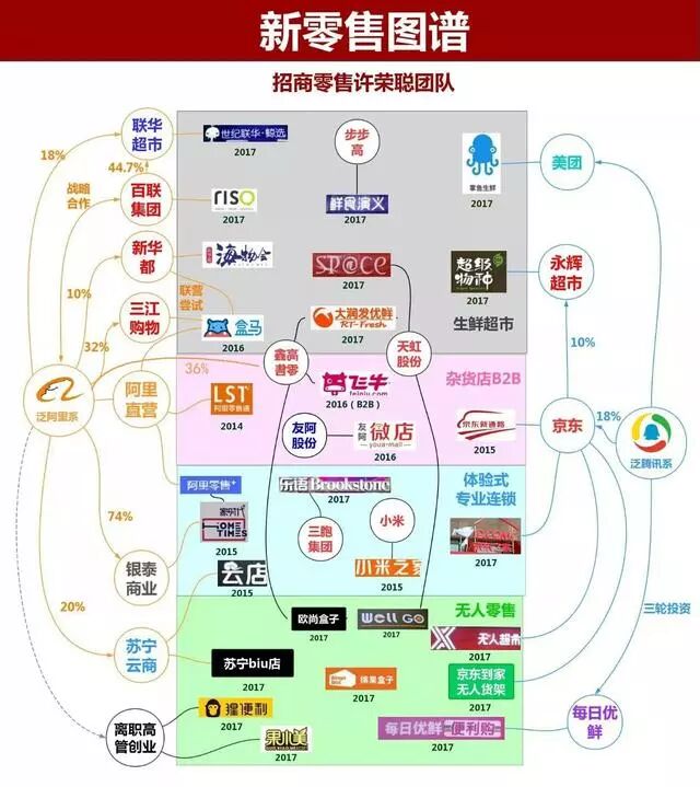 不到两年,我们耳熟能详的传统超市,就变了模样。 阿里收购了联华、百联、大润发、银泰和三江购物;而腾讯拿下了永辉和沃尔玛,如今又把家乐福收入麾下。 阿里和腾讯几乎把持了中国零售的半壁江山。 新零售战争一触即发。 这就是新零售的进取,对比家乐福5年才开30多家便利店的龟速,快到不可思议!