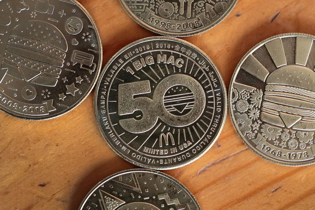 为庆祝巨无霸汉堡今年迎来50周年庆,麦当劳全球同步发行巨无霸纪念币MacCoin,8月6日,中国内地2500家指定餐厅免费送出超过100万枚。