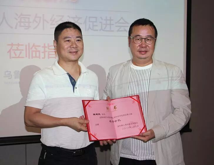 深圳潮人海外经济促进会会长赵财强先生(右)邀请新疆乌鲁木齐潮汕商会会长陈建民先生(左)成为深圳潮人海外经济促进会名誉会长 ![]() ![]()