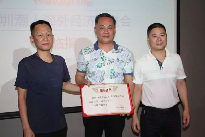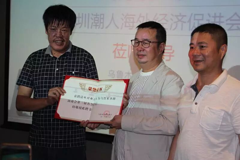 新疆乌鲁木齐潮汕商会荣誉会长李少龙先生(左)新疆乌鲁木齐潮汕商会会长陈建民先生(右)邀请深圳潮人海外经济促进会常务副会长、国际潮青会名誉会长、汕头海外联谊会名誉会长陈健辉先生(中)成为新疆乌鲁木齐潮汕商会名誉会长