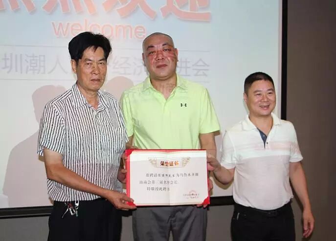 新疆乌鲁木齐潮汕商会创始会长邱汉贵先生(左)新疆乌鲁木齐潮汕商会会长陈建民先生(右)邀请深圳潮人海外经济促进会会长赵财强先生(中)为新疆乌鲁木齐潮汕商会名誉会长