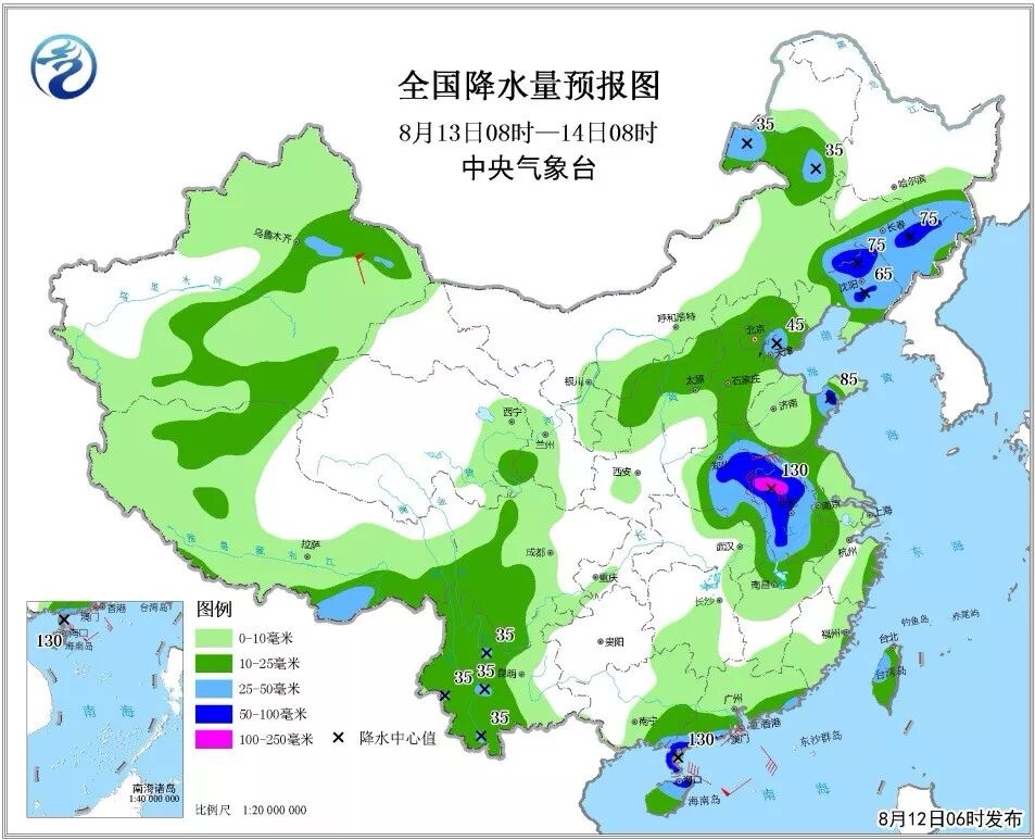 8月13日08时至14日08时,内蒙古东部、东北地区中南部、华北东北部、黄淮中部和东部、江淮中部、华南南部以及新疆东北部和云南西部等地的部分地区有大雨或暴雨,其中,安徽北部、广东西南部局地有大暴雨。