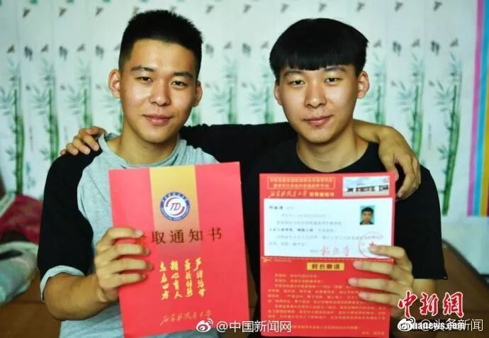 河北石家庄正定县的双胞胎兄弟邢振波和邢振涛,近日一起收到了大学录取通知书。这对兄弟在今年的高考中都考出了564分,同时被石家庄铁道大学的同一个专业录取,还分到了同一个班级。网友:实至名归的双胞胎。