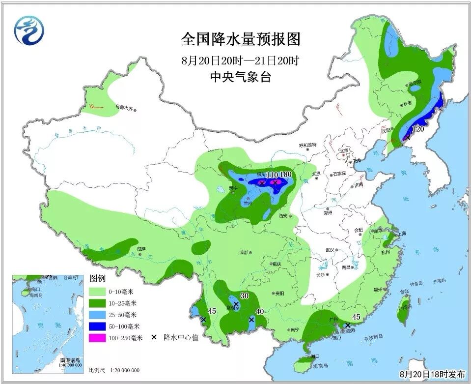 8月20日20时至21日20时,辽宁东部、吉林东部、黑龙江东南部和西北部、甘肃中东部、宁夏、内蒙古西部偏南地区、陕西西北部等地有大到暴雨,其中,辽宁东部、宁夏中部等地的部分地区有大暴雨;上述部分地区伴有短时强降水。