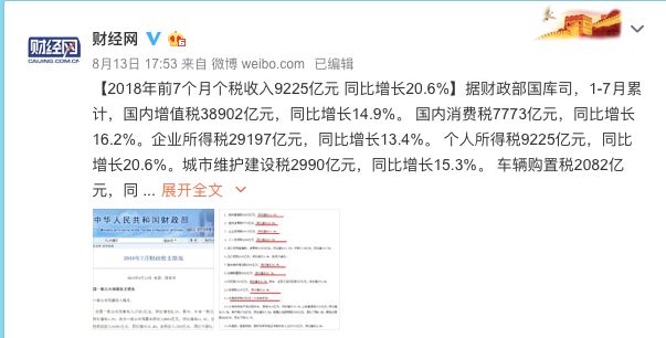 前几天,财政部发布了2018年1~7月的税收收入数据,根据数据显示:占据税收大头增值税、消费税、企业所得税个人所得税,皆实现了10%以上的增长;另外,总体税收收入增幅达到了20.6%。 政策的落地性,一目了然。