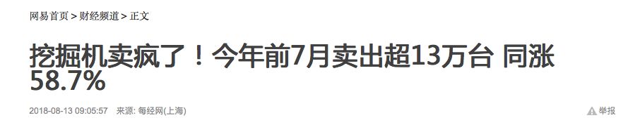 微观上:国务院还明确表态,在安排地方财政赤字8300亿的基础上,要加快今年1.35万亿地方政府专项债券发行和使用进度; 另外,据中国工程机械工业协会挖掘机分会行业统计数据显示,2018年前7个月,各类挖掘机销量创纪录,卖出了131246台,同比增幅达到了58.7%。