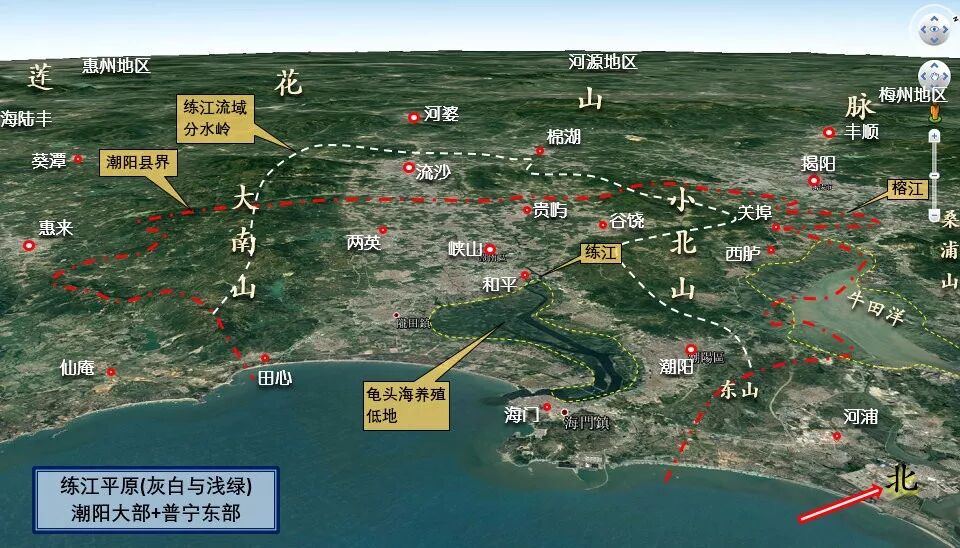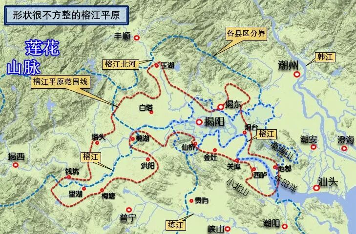 榕江流域范围可就广了,整个揭阳(揭东县+榕城区),还有东南小半个揭西(榕江北岸),普宁北部里湖洪阳等地(榕江南岸),潮阳的关金灶飞地,丰顺的最南端,通通都是榕江水系,通通操揭阳口音。榕江平原范围虽广,却因受到四周各条山脉横来插去,搞得平原形状很不规整,因而总面积不是很大,居民人口甚至都没有练江平原上多。