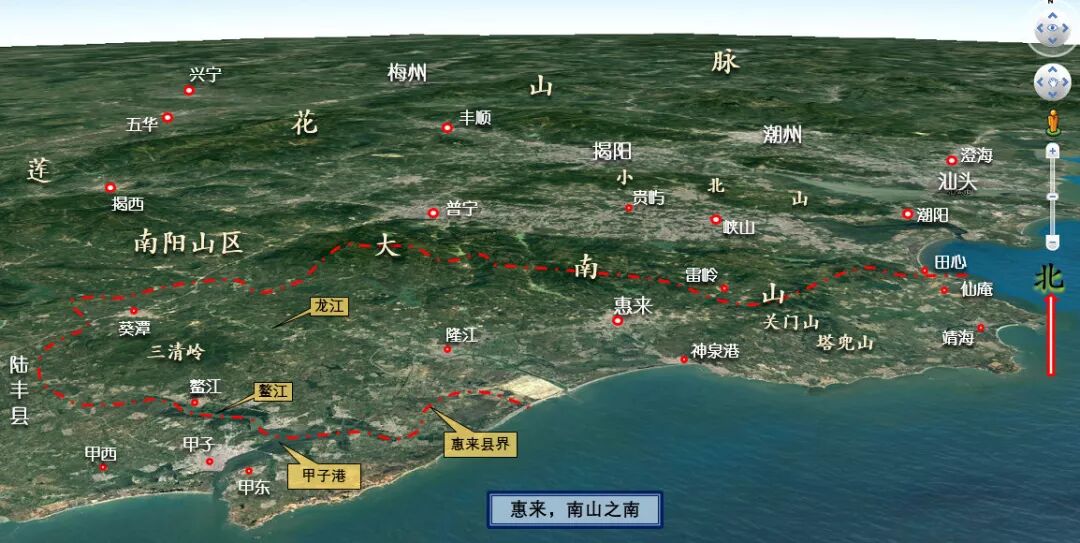 从潮阳跨过大南山即是惠来,这边龙江下游惠城隆江(猪脚哦)有一片中型平原,并影响周围山海之间的靖海、神泉、葵潭等小地块,统起来成为惠来县。另外,陆丰的三甲地区挨着惠来,说的也是惠来口音,三甲地区的人们,非常坚决的认定他们百分之百是潮汕人。葵潭人并不认为他们是惠来的卫星地,由于甲子港深入内陆,葵潭是海陆丰、惠来、潮汕核心区这三个地域的极为关键的交通枢纽地,兵家必争,没哪次粤东战役不涉及到葵潭的。