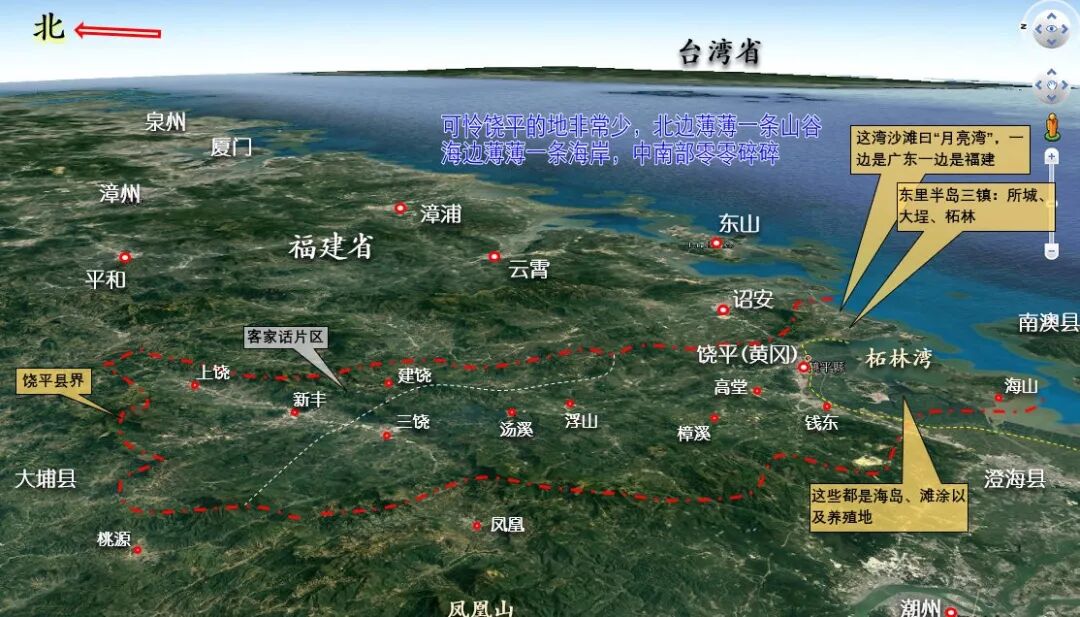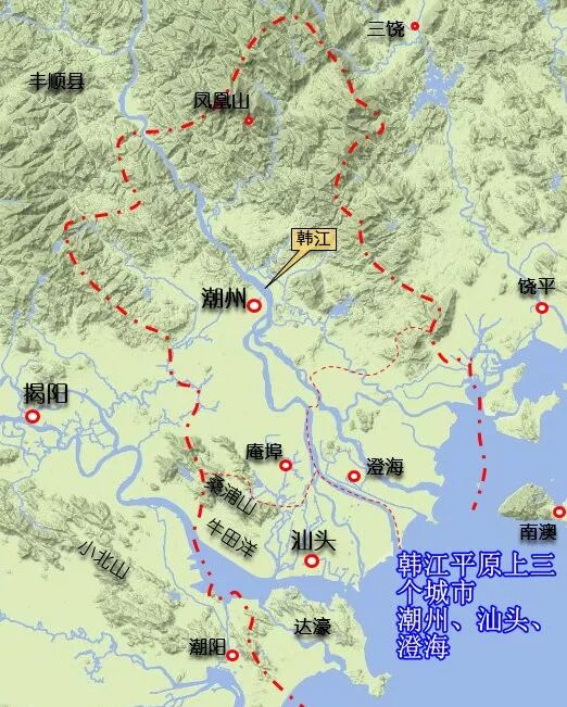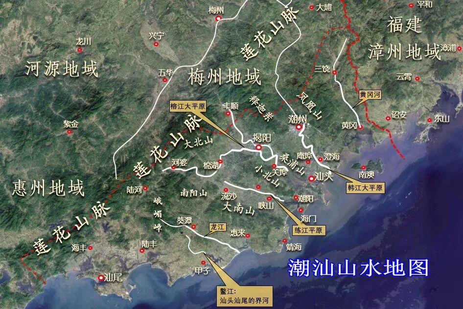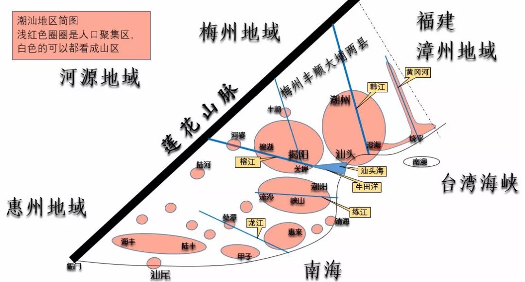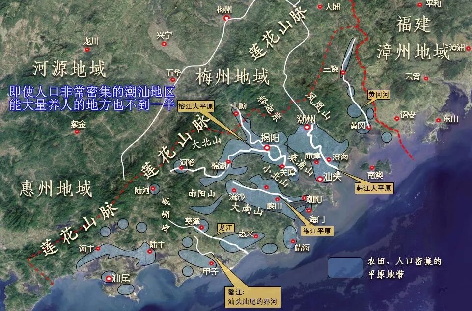 所以潮汕地理气候条件虽然奇佳,奈何空间过于狭小,潮汕物产虽然丰富,生产力却总赶不上人们生孩子的速度,邻近四周几乎没有扩展的空间,随着番薯的传入清朝人口大爆炸,潮汕人大规模向更远的域外海外移民打拼,成为必然。 潮汕地理范围如何形成的? 潮汕地域的形成,有自然地理的因素,也有行政人为的。潮汕的西北边,是粤东巨大的莲花山脉,莲花山脉从西南到东北斜斜地一个半躺,就把潮汕人的活动范围给限制在大山大海间不到30度的狭窄夹角里面。