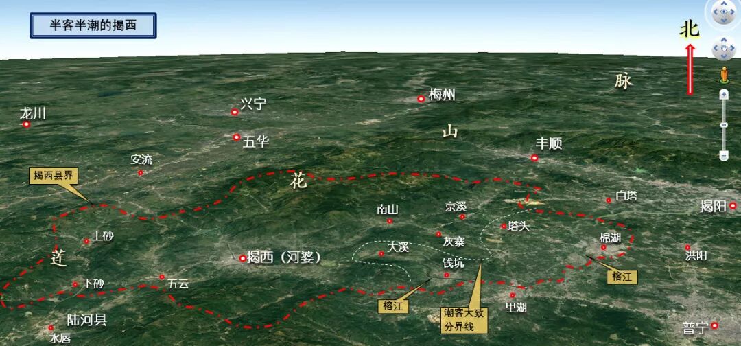 揭西是从揭阳分出来的一个潮客各半的县,潮客间很好分,沿着榕江北岸,山下江岸平原是潮汕,山上山里的是客家,山岭到平原间的丘陵地带则潮客混杂,有很多潮客双语乡。西部山里有一块较大的盆地,就是揭西县城河婆。