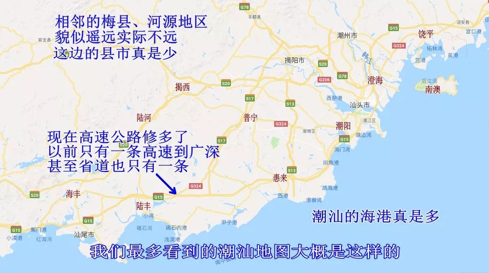 海陆丰本地的潮汕话(假如算的话),声调最硬最重,特别有气势,号称天上雷公,地上海陆丰。潮州人说,“宁可和潮州人吵架,不要和潮阳人说话”,假如碰到汕尾兄弟,大概会当场震破耳膜。从卫星地图可知,海陆丰地区面积虽大,平原耕地却不多,整个地级市的闽南语系人口,都没有潮阳多。