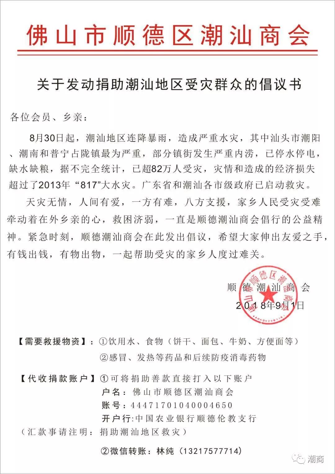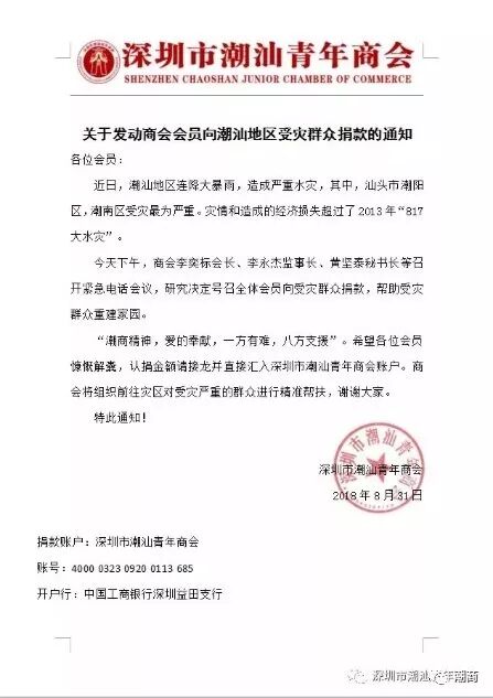 提示:点击上方"潮商"关注我们 ![]() 8月30日,潮汕大雨倾盆。强降雨造成潮汕部分地区内涝,部分村居受浸,农作物受灾,房屋倒塌,水利设施受损……灾情牵动着海内外潮商的心,他们纷纷行动起来积极支援家乡抗洪救灾。 加拿大潮商会连夜为受灾群众捐衣送物 林少毅、方俊洪、曾斌、郑焕明、蔡光等几位加拿大潮商会会长、副会长率先行动捐款,并连夜组织人员采购救灾物资,部分会长亲临一线,把救灾物质亲自护送到灾区。多位会员也纷纷捐款捐物。 ![]() ![]() ![]() 深圳潮商会紧急组织救灾物资运往灾区 得知潮汕地区遭遇严重水灾事件后,深圳市潮汕商会吴木棠会长、黄育宏驻会会长、吴振城监事长、邓东书记等人第一时间召开紧急电话会议,向会员发出《关于发动商会会员向潮汕地区受灾群众捐款的通知》,与潮阳、潮南区民政局联系对接有关救援物资事项,并立即购买救援物资送往受灾地区。 ![]() ![]() 深圳潮汕商会的会员们迅速响应,通过电话、微信等形式募捐接龙,经过30个小时地积极发动,截止9月1日晚上11点半,共196位会员为受灾地区认捐善款2201200元,目前认捐数额仍在持续增长。 海内外潮商会紧急动员,组织大家献爱心 水灾发生后,海内外各潮商会纷纷行动,紧急动员发起赈灾倡议,组织采购救援物资等,均得到积极响应。更有会员奔赴一线参与赈灾工作。 ![]() 广东省潮商会开会商讨赈灾事宜 ![]()