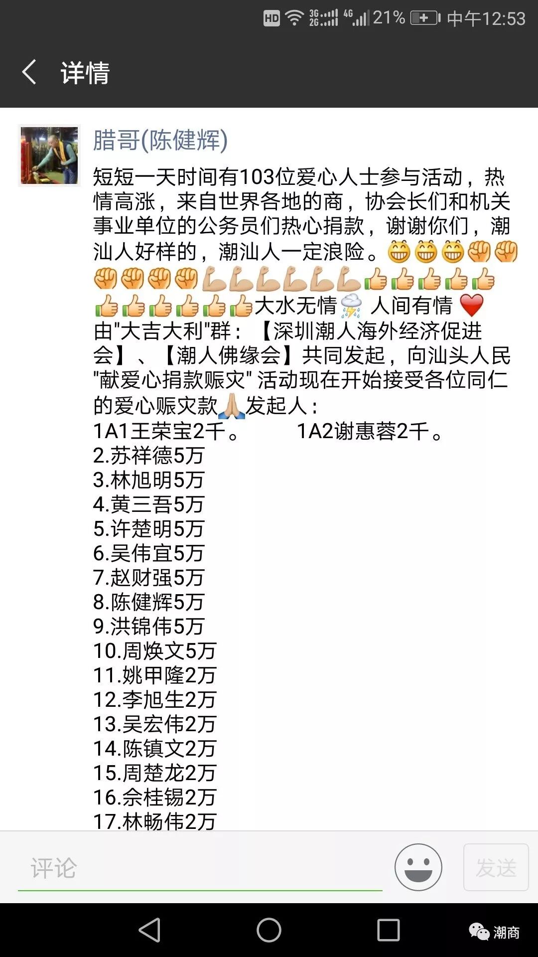 ![]() ![]() 陈健辉会长的大吉大利群发起接龙捐款 由深圳市汕头商会常务副会长、深圳市潮汕商会名誉会长陈健辉建立的大吉大利微信群则发起了接龙捐款,短短一天内已有超过百位爱心人士参与。 ![]() 目前捐款接龙仍在继续,善款将捐赠家乡的慈善机构。 天灾无情,人间有爱。2018年潮汕最亲切、最感人的三个词——“有人无”、“用食敏”、“送物资”(潮汕话),一方有难,八方支援,一起守护家园,携手度过灾难。祈福潮汕!潮汕加油! 5年前 我们曾相信 雨过见彩虹 晴朗会回来 今天 我们还相信 雨过出彩虹 晴朗要回来 5年后 我们仍相信 雨过有彩虹 晴朗能回来 我们永相信 这里是家园 晴朗成愿望 ![]() 声明:本文不代表我们的观点,仅供读者参考。文章版权归原作者所有,如有侵权,请联系我们进行删除。 潮 商 ∣ 走遍天下 · 根在潮汕 文化的境界 · 财富的智慧