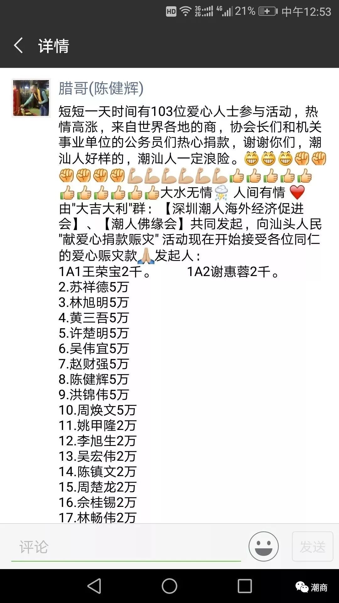 大水无情,人间有情。向汕头受灾群众 "献爱心捐款赈灾" 活动现接受各位同仁的爱心赈灾款。 发起人: 1A1王荣宝2千 1A2谢惠蓉2千 2.苏祥德5万 3.林旭明5万 4.黄三吾5万 5.许楚明5万 6.吴伟宜5万 7.赵财强5万 8.陈健辉5万 9.洪锦伟5万 10.周焕文5万 11.姚甲隆2万 12.李旭生2万 13.吴宏伟2万 14.陈镇文2万 15.周楚龙2万 16.佘桂锡2万 17.林畅伟2万 18.赵楚龙2万 19.林伟泉2万 20.林鹏2万 21.彭少龙2万 22.李淼1万 23.陈建民1万 24.詹良财1万 25.周德锋1万 26.张钦贤1万 27.周小萍1万(药品) 28.林春寒6千 29.刘钟彬4千 30.九华山广曾法师2千 31.黄秋发2千 32.黄泽强2千 33.肖慈宣2千 34.蔡伟淮1千 35.赵海龙2万 36.陈怡毫2万 37.赵质明2万 38.赵德坚2万 39.蔡中南2万 40.廖荣6千 41.吴忠泽2千 42.郭丰海2万 43.黄勤城2千 44.罗少彬2万 45.赵元廷1万 46.周昭彬2万 47.姚海文2222元 48.陈楚波2222元 49.陈伟生2千 50.好心人8千 51.郑石非2千 52.周伟亮2万 53.张建国2千 54.赵杰雄2千 55.洪汉忠2万 56.陈芳铭2千 57.蔡汉财2万 58.林子雄2千 59.张小莹5千 60.李大杰2万 61.陈汉森5千 62.刘楚光3千 63.林泽华3千 64.张伟杰2万 65.林楚东5千 66.郑焕奇2万 67.郑晓雄2万 68.黄坤炎2万 69.赵彦丰3千 70.方美强3千 71.周南2万 72.郑金华2千 73.张盛旭1万 74.黄懿光2千 75.黄子鹏2222元 76.张淞茶3千 77.陈岳群2万 78.周厚立3万 79.姚乔辉1万 80.陳啓雄1万 81.林盈 1万 82.姚金城1万 83.吴晓洪1万 84.赖朱明2万 85.陈楚涛2千 86.黄镇城3千 87.张淑婷6千 88.李长豪5千 89.杨展雄2万 90.张乙洲1万 91.巫福徐1万 92.郭克勤1万 93.林志斯5万 94.赵淑雄1万 95.好心人8千 96.倪壁雄1万 97.孙逸楷,5万油米 98.罗锡文1万 99.蓝楚汉5万 100.陈文雄2千 101.钟建生1万 102.郑儒岳2万 103.曾良春5千 104.戴泽龙2千 105.黄镇文2千 106.杨瑞士2万 107.刘新龙1万 108.倪汉川2万 109.好心人5千 110.好心人2千 111.陈喜鹏2千 112.好心人2千 113.黄晓毅2千 114.郭永大2千 115.李观炜1万 116.张秀芳5千(已到帐) 117.张加荣5万 118.马辉1万 119.杨景超2千 120.刘荣溪2千 121.陈奕成2千 122.许幼晶5万 123.许钟创5万 124.许钟民5万 125.许伟镇5万 126.黄梅麟1万 127.于晓斌2千 128.张晓龙2千 129.林万勇2千 130.王招牌1万 131.谢勇锐2千 132.周伟茂2万 133.许钟国5万 134.许钟平5万 135.林秋华1千元 136.谢炎武1万 137.秦东明5千 138.周志忠2千 139.许其伟2千 140.郭俊宏5千 141.许自炼2千 142.曾斌5万 143.林楚文1万 144.吴镇耿2万 145.庄婵莲1万 146.李业展5千 147.好心人5千 148.赵晓峰2万 149.魏泽伟1千 150.罗少龙2万 151.陈健燕1万 152.王志明2千 153.黄梅强1万 154.周楚龙2万 155.庄俊鹏1万 目前捐款接龙仍在火热进行中,善款将捐赠家乡的慈善机构。潮人精神,爱的奉献,一方有难,八方支援!我们潮汕人好样的! |