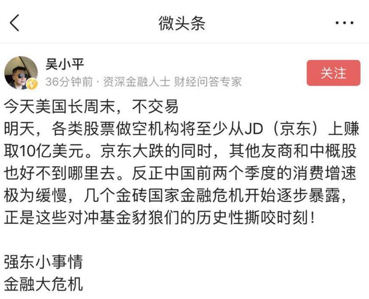 但刘强东近年更多的形象是敢言。在两会上,刘强东呼吁立电商法。他直言,电子商务已成为国内零售业发展不可或缺的力量,但假货、“水货”是制约电子商务进一步发展的重要问题。要遏制假冒伪劣,除电商平台要加强自律外,相关监管政策、法规的出台也刻不容缓。 今年8月,疫苗事件闹得沸沸扬扬,刘强东表示他会向政协提案,会发动身边的亲人、朋友,会竭尽所能,在法律范围内,讨要一个说法。刘强东认为,本次假疫苗事件“比那些制造假阿迪、耐克的性质恶劣百倍!这些人不仅应该罚他个倾家荡产,更应该施以重刑!”截至目前,刘强东这条内容阅读量已过亿,赢得公众赞誉。 现在事件已不在于性侵案真相本身,而在于刘强东多年经营的公众形象,还有公司信誉,公众形象等,在纽约时报、华尔街日报等国际舆论影响下的坍塌。 在媒体的狂欢炒作下,人们已不太关注刘强东事件的真相了,而是那张对公众形象造成错觉的照片,那就达到效果了。 京东与华尔街 今天,有一种说法是质疑事件与华尔街的关系。 坦率的说,我不知多大程度有关。但华尔街日报等代表着华尔街资本的利益,这是个事实。 今年以来,京东股价持续下跌,最新股价显示跌至最低30.76。自今年1月创下50.68美元纪录最高价以来,京东股价已经暴跌四成,截至上周五收市,京东股价报31.30美元,市值452亿美元。半年多时间,京东市值蒸发高达280亿美元,折合人民币1912亿元。 与中国股市不同,美股有做空机制,一个公司业绩如果持续趋好但股价的持续大跌,就不难排除做空的因素了。 另一方面,华尔街资本与京东是有些着些恩怨。京东集团早期依靠红杉、高领等资本。后来,京东依托互联网金融发展出了京东金融等。2017年3月1日,京东集团签署了关于重组京东金融(负责运营京东互联网金融业务)的最终协议,京东金融从母公司拆分出来,这是京东比较赚钱的业务,当然触及到背后大股东的利益。 后来,华尔街资本对京东的股份逐渐出局,而且刘强东还能控制京东。这不排除是他们会有做空的动机,做空的另一种手法是商业舆论战。比如炒作丑闻,打击企业掌门人,进行毁誉行动。之前有刘强东的澳大利亚性侵丑闻,这次又在美国大本营上演性丑闻,多大程度是事实还是西方舆论,已分不清。但是这种舆论对京东的影响却是实在的,而且性丑闻又是最容易吸引眼球的。