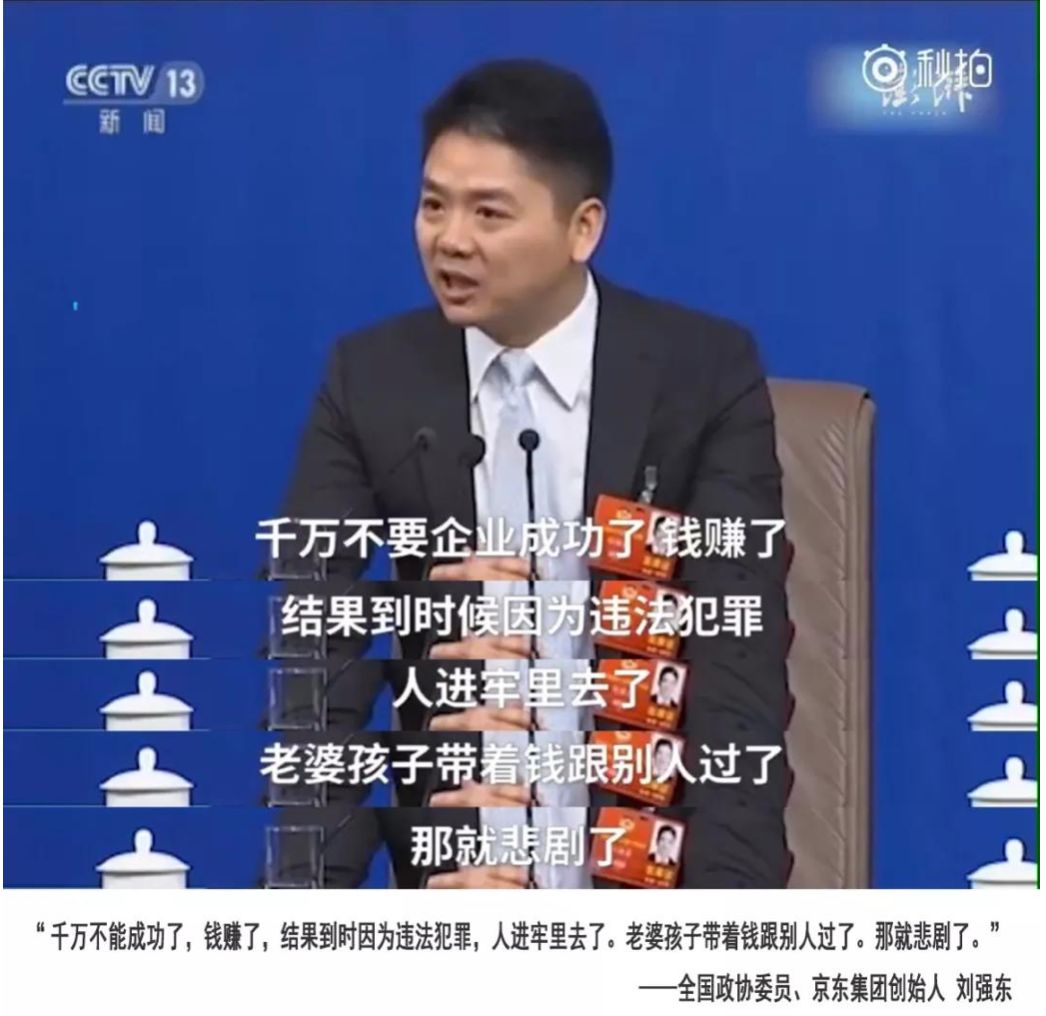美媒在报道事件时,特意选用了刘强东在人民大会堂的照片作传播。一个公众人物,有多少正面形象,负面舆论同样会对其造成同等的重伤。 与今天舆论狂欢的是,刘强东今年两会的一则发言刷屏朋友圈:“千万不能成功了,钱赚了,结果到时因为违法犯罪,人进牢里去了。老婆孩子带着钱跟别人过了。那就悲剧了。”