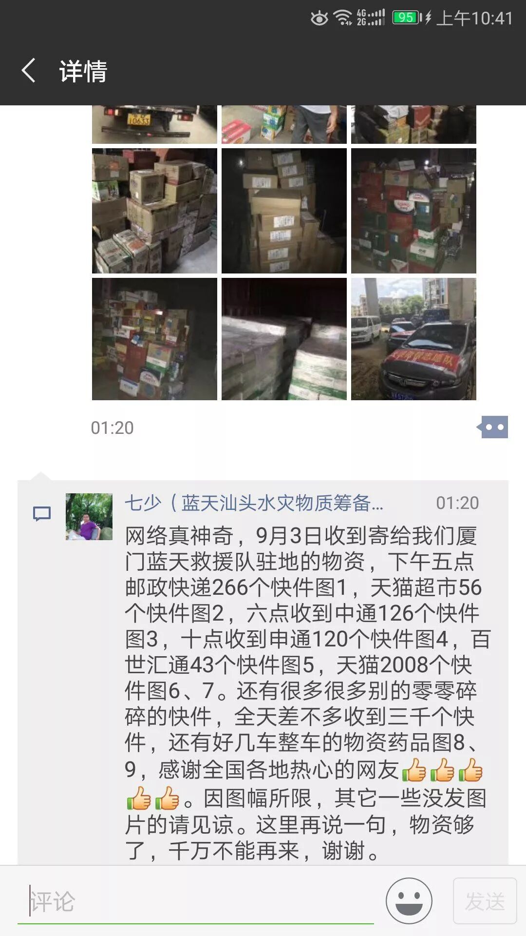这是刚清空的大本营,晚上11点,又收到物流车配送来的1千多个包裹的爱心物资。