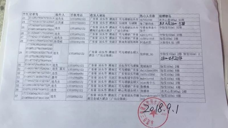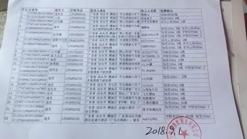2018年9月3日爱心企业爱心人士 1.潮汕段友会爱心捐赠:两袋连体胶裤,三箱消毒粉,一箱藿香正气水,一箱消毒液一箱蜡烛。 2.爱心网友爱心物质物流:一千多件 3.陈建潮捐1000(支助蓝天救援队,由于工作人员工作疏忽一笔捐款分2次公布,他总数捐2000元) 4.邱鲤明捐200 5.吴上义1000捐给蓝天做救援经费 6.朱文衡捐1000 7.峡山刘少武捐2000 8.胡钦源 郑楚伟捐2000现金(给蓝天补贴汽油费) 9.潮汕后生班捐5600 10.谢晓端捐1000(500做救援经费500购买物质) 11.郑东琦捐1500(对公账户) 12.峡山胡钦泉捐500