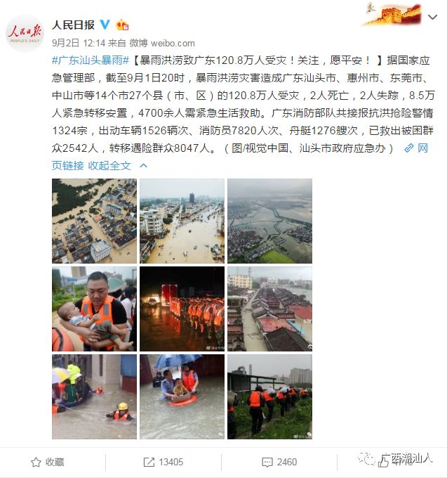 尊敬的各位会员、乡亲: 天灾无情人有情,一方有难,八方支援。扶危济困,一直是广西潮人三会倡行的公益精神!家乡人民受灾受难牵动着我们在外乡亲的心,值此紧急时刻,广西潮人三会特向广大会员以及在桂乡亲们发出倡议,希望大家伸出友爱之手,奉献一份爱心,大家有钱出钱,有力出力,一起帮助受灾的家乡人渡过难关! 祝愿潮汕人民平安渡过水患,家人能够尽早团聚!