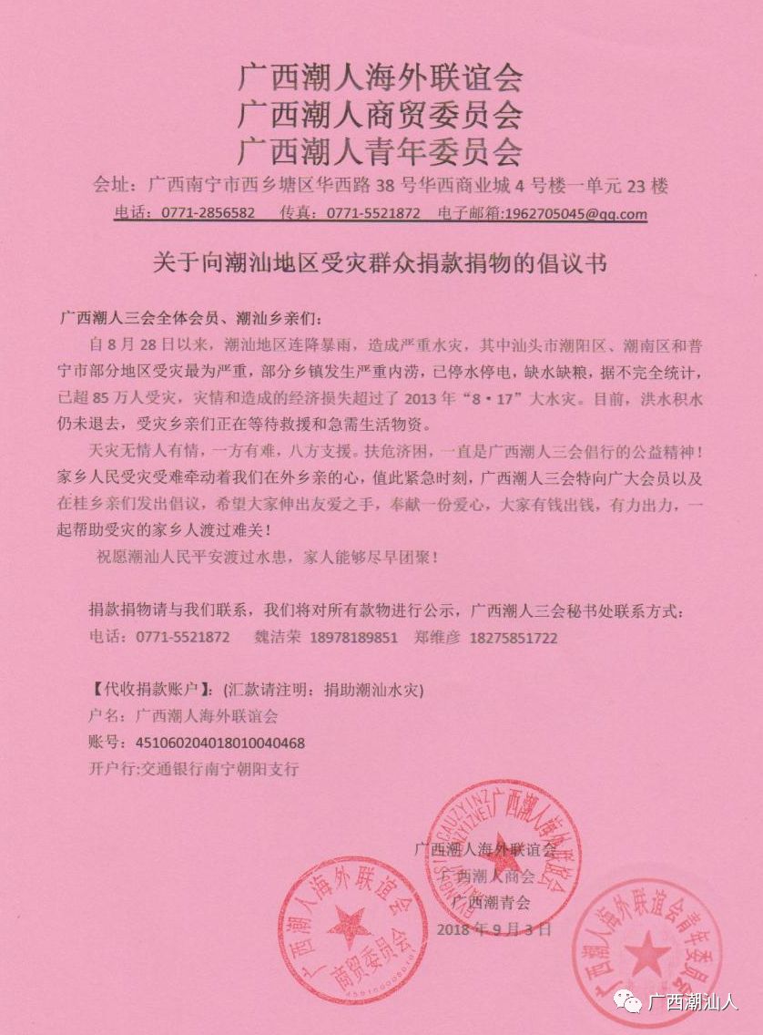 【代收捐款账户】:(汇款请注明姓名和捐助潮汕水灾) 户名:广西潮人海外联谊会 账号: 451060204018010040468 开户行:交通银行南宁朝阳支行 广西潮人海外联谊会 广西潮人商会 广西潮青会 2018年9月3日
