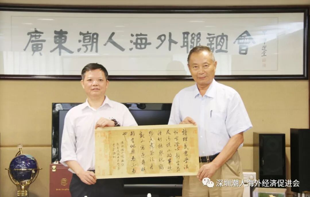 为纪念这美好时刻,两会互赠纪念品 本会会长助理叶笑兰、常务副秘书长林茂辉随行拜访,广东潮联会常务副秘书长兼办公室主任江创旭,副秘书长兼办公室副主任郑素兰,办公室副主任欧阳永晟也陪同接待。
