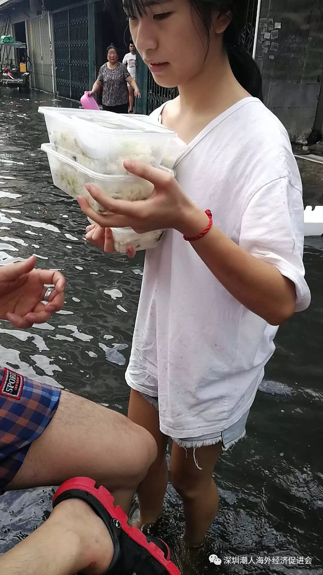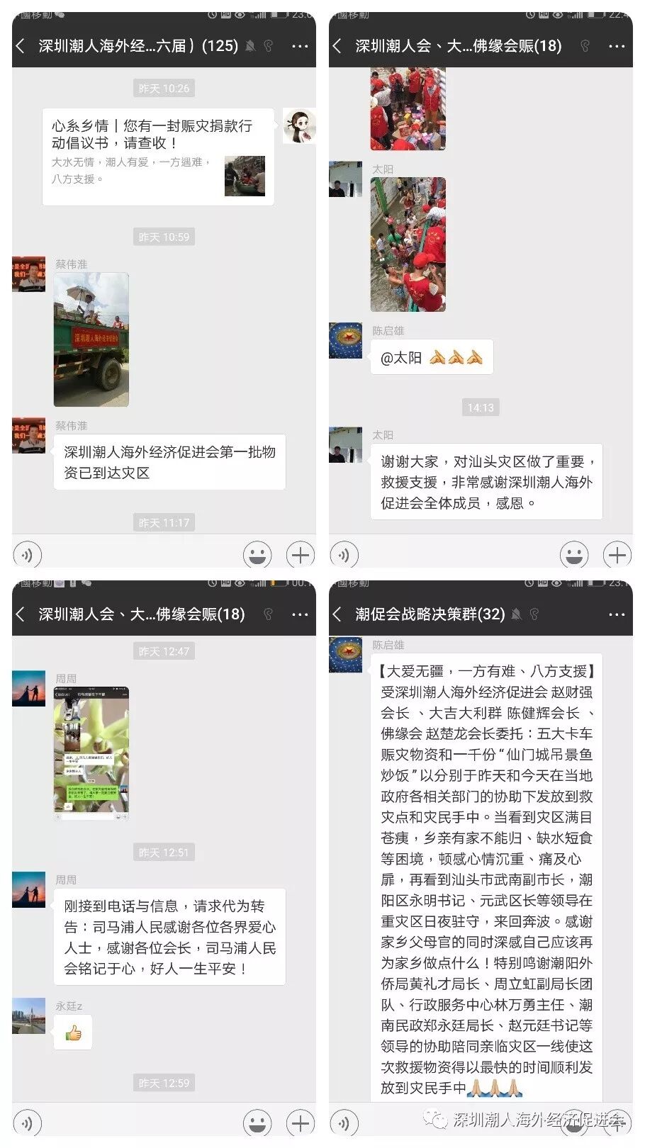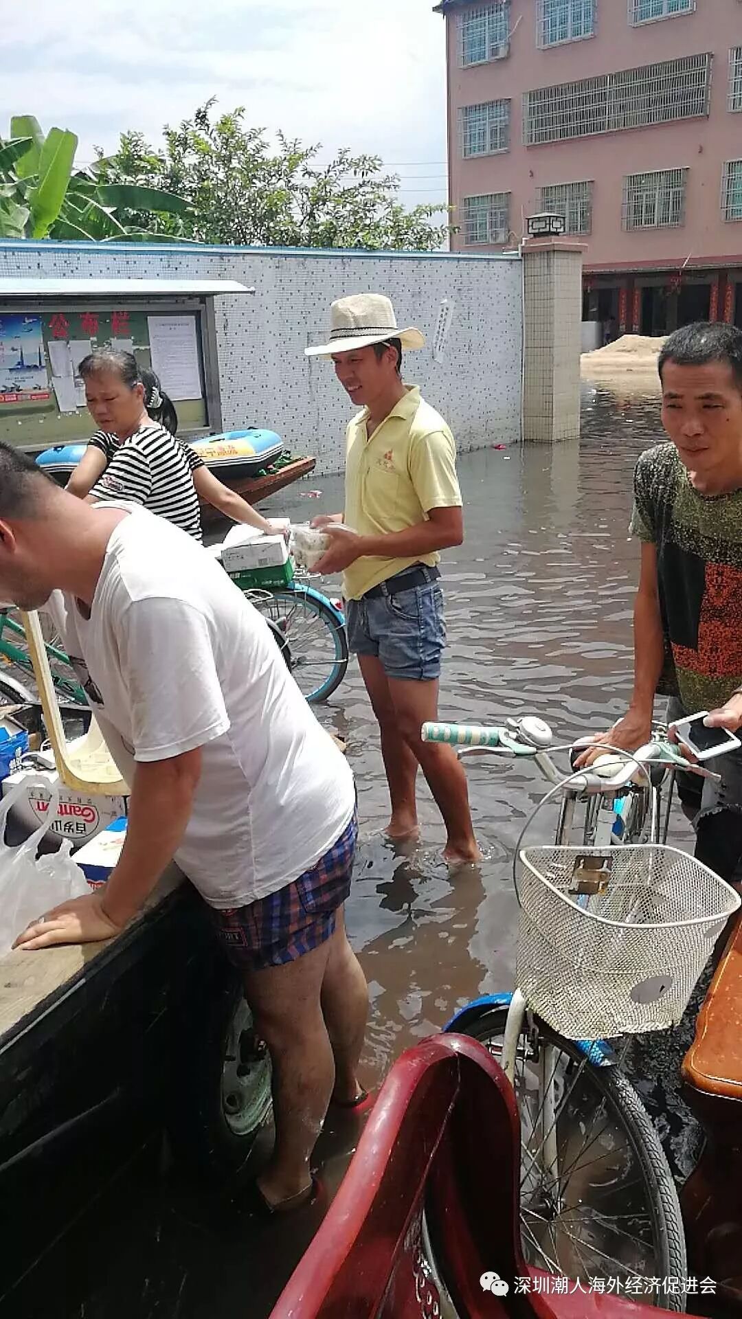救灾现场 ![]() 潮人在行动 8月30日,深圳潮人海外经济促进会在得知汕头洪灾的消息后,立即成立由赵财强会长为总指挥的临时救灾工作组,连夜召开紧急会议,研究募捐、前线救济、物资发放等相关事宜。同时,由本会常务副会长陈健辉为发起人,联合大吉大利群和潮人佛缘会共同发起救灾募捐活动。 ![]() 陈启雄常务副会长在前线了解灾情 9月2日下午,阿联酋潮汕总商会会长、本会常务副会长陈启雄代表大吉大利群、深圳潮人海外经济促进会和潮人佛缘会,亲自带队将募捐而来的部分款项购买的矿泉水、牛奶、快餐、面包、方便面、大米、食用油等物资送往谷饶镇、铜盂镇等受灾较为严重的地区。并与汕头市副市长陈武南,潮阳区委书记蔡永明、区长张元武等领导会面,了解灾情,紧急实施救援和物资发放工作。本会常务副会长张盛旭随行协调工作。时至今日,本会救灾工作组仍坚守与乡亲们同在,赈灾工作还在紧张进行之中。