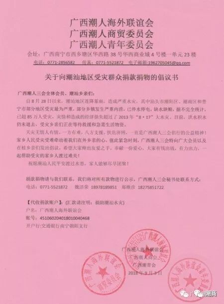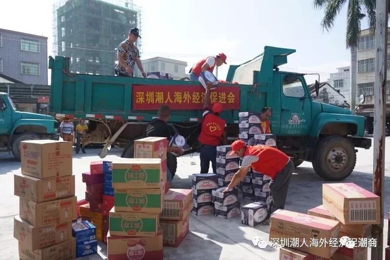 在国内经商的潮商及海外华侨闻讯之后,纷纷慷慨解囊,来电、汇款、安排人员参与救援。在8月9日,香港潮州八邑会馆便先行送来600包大米,此后,各地潮商及华侨会馆、医院等送来大米、药材、篷盖等赈灾物资,汇来多笔款项。