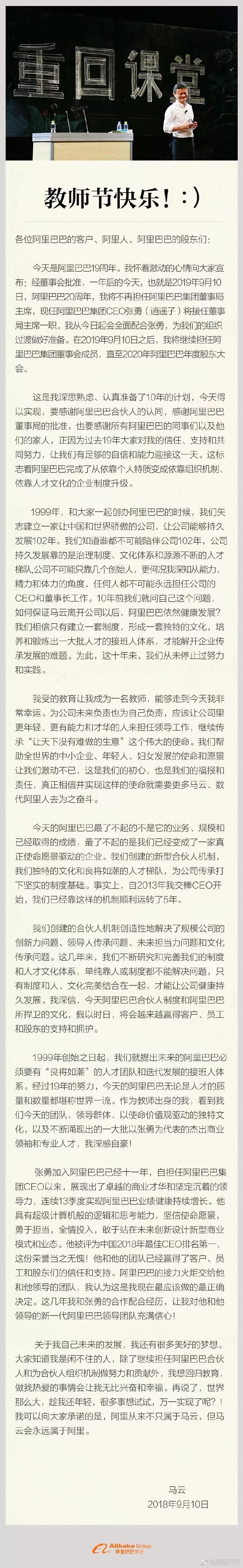 提示:点击上方"潮商"关注我们 9月10日教师节当天,阿里巴巴集团创始人马云发出题为“教师节快乐”的公开信宣布:一年后的阿里巴巴20周年之际,即2019年9月10日,他将不再担任集团董事局主席,届时由现任集团CEO张勇接任。