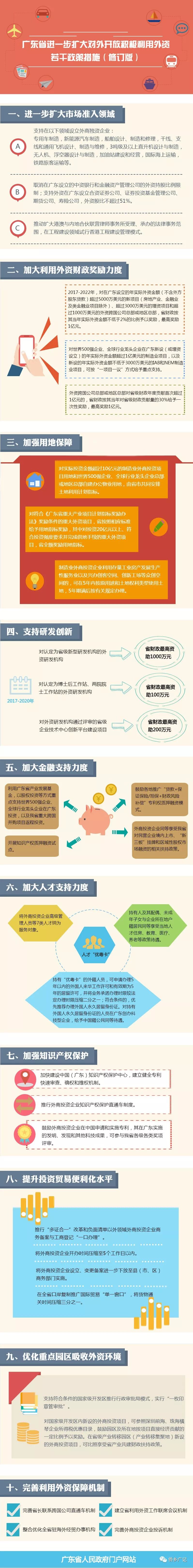 提示:点击上方"潮商"关注我们 《政策措施》从市场准入、财政奖励、用地保障、研发创新、金融支持等十个方面制定利好政策,较此前备受关注的“外资十条”开放程度更高、政策措施更具体。比如,从提出扩大新能源汽车制造领域的外资股比限制,到明确可在该领域设立外商独资企业。 新能源汽车领域可设立外商独资企业 《政策措施》提出,全面落实《外商投资准入特别管理措施(负面清单)(2018年版)》,支持在以下领域设立外商独资企业,包括专用车制造,新能源汽车制造,船舶设计、制造和修理,干线、支线和通用飞机设计、制造与维修,3吨级及以上直升机设计与制造,无人机、浮空器设计与制造,加油站建设和经营,国际海上运输,铁路旅客运输等;取消在广东设立的中资银行和金融资产管理公司的外资持股比例限制,支持外国银行在广东同时设立分行和子行;支持外资在广东设立合资证券公司、证券投资基金管理公司、期货公司、寿险公司,外资股比不超过51%。 加大利用外资财政奖励力度 《政策措施》提出,2017-2022年,对在广东设立的年实际外资金额(不含外方股东贷款,下同)超过5000万美元的新项目(房地产业、金融业及类金融业项目除外,下同)、超过3000万美元的增资项目和超过1000万美元的外资跨国公司总部或地区总部,省财政按其当年实际外资金额不低于2%的比例予以奖励,最高奖励1亿元。 对世界500强企业(以《财富》排行榜为准,下同)、全球行业龙头企业在广东新设(或增资设立)的年实际外资金额超过1亿美元的制造业项目,以及新设的年实际外资金额不低于3000万美元的IAB(新一代信息技术、人工智能、生物医药)和NEM(新能源、新材料)制造业项目,可按“一项目一议”方式给予重点支持。 推行人才“优粤卡” 7类人才纳为服务对象 推行人才“优粤卡”,将外商投资企业高级管理人员等7类人才纳入服务对象。扩大“优粤卡”在广东省可作为身份证明使用的领域。“优粤卡”持有人及其配偶、未成年子女与企业所在地户籍居民同等享受当地人才住房、教育、医疗、养老等政策待遇,其中境内持有人及其配偶、未成年子女可在广东办理赴港澳签注及其他出入境证件。 ![]() 来源:广州日报 声明:本文不代表我们的观点,仅供读者参考。文章版权归原作者所有,如有侵权,请联系我们进行删除。 潮 商 ∣ 走遍天下 · 根在潮汕 文化的境界 · 财富的智慧