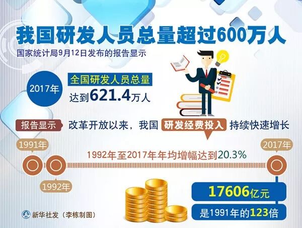 国家统计局12日发布的报告显示,2017年,全国研发人员总量达到621.4万人。