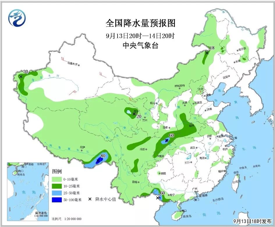 9月13日20时至14日20时,内蒙古大部、新疆南部、西藏、青藏高原大部、华北西部、黄淮中西部、江汉西部、西南地区大部、广西南部等地有小雨,其中部分地区有中到大雨、局地暴雨。