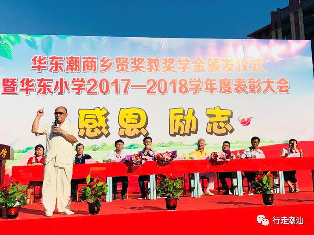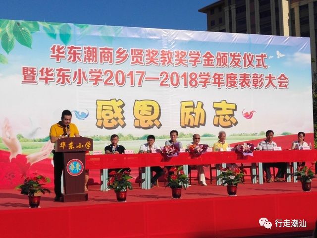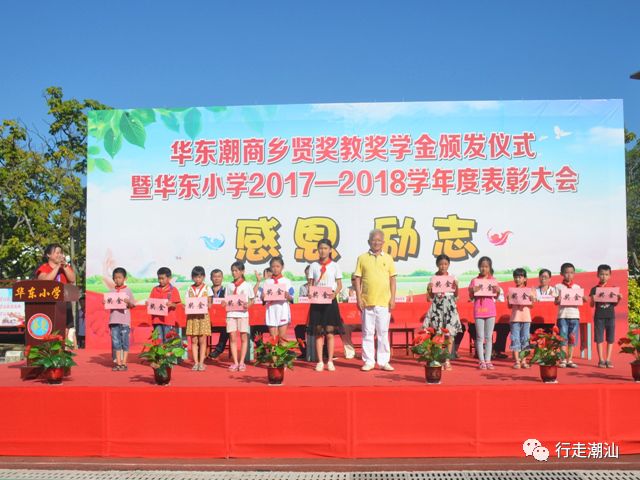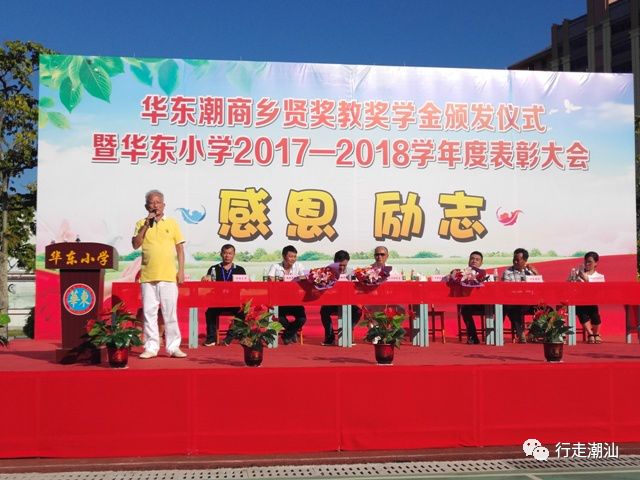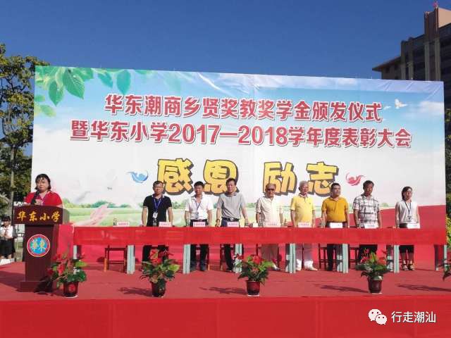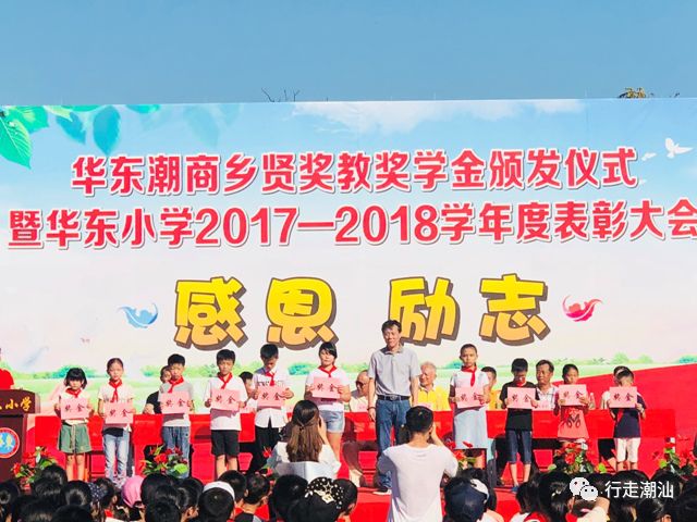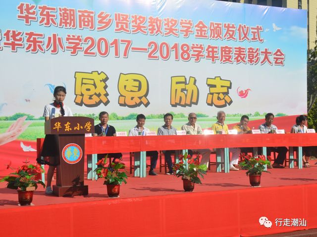 为树立典型、表彰先进、弘扬正气,凝聚力量,激励全校师生奋发进取, 2018年9月21日下午四时,华东小学在学校运动场举行华东乡贤奖教奖学金颁发仪式暨华东小学2017-2018学年度表彰大会。出席本次大会的有华东乡贤吴开松先生、卓振波先生、吴茂强先生,华东村党支部书记吴茂才同志,村委员领导林学通同志,以及学校领导班子成员、各年级优秀学生的家长代表和全校师生。