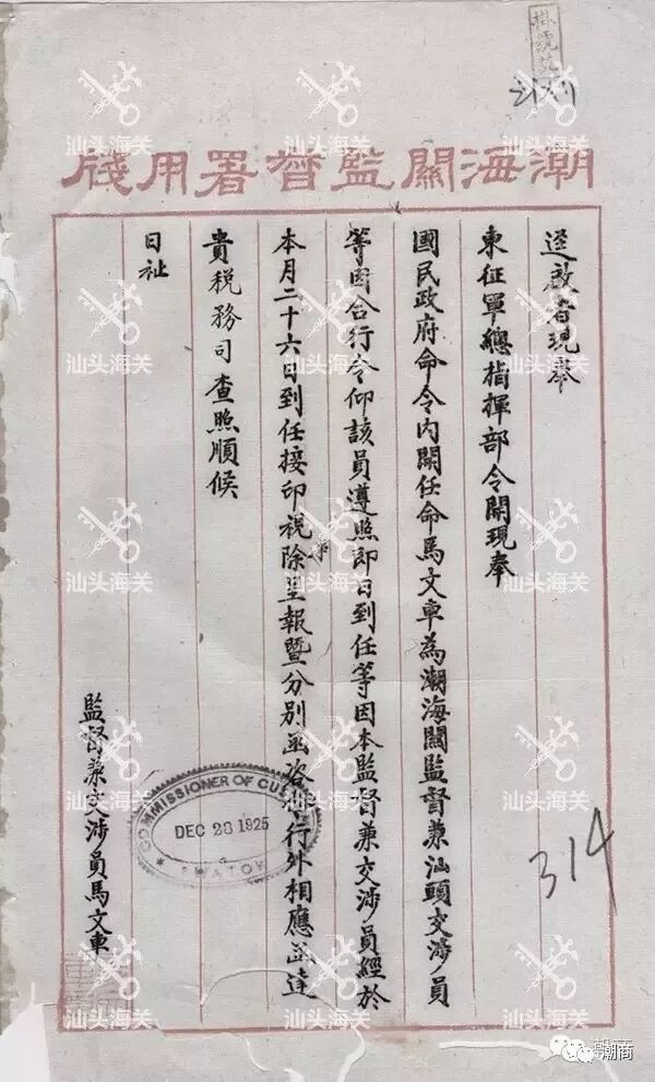 马文车原是广东政法大学毕业生,当过蒋介石秘书,参与第二次东征,被任为东征军总指挥部军法处处长,1925年12月被国民政府命为潮海关监督兼交涉员,代表我国政府与潮海关打交道。 ![]() 黄埔军东征时蒋介石做演讲 马文车走马上任后,看到当时省港大罢工的反帝熊熊烈火,和周恩来主政东江后潮汕工农运动如火如荼,具有民族骨气与爱国心的他,已按捺不住内心激情,才上任10天就向东征军总指挥呈报:拟将潮汕50里内常关从外国人手里收回。 ![]() ![]() 周恩来对此壮举十分支持,并指出:收回海关关税自主,收回租界,收回教育权,这是国民革命天经地义的正当权益。马文车的呈报得到批准后,翌年1月18日晚深夜,召开紧急会议,向准备收回的庵埠等七个卡口的人员,进行慎密的部署,并当场任命邵元济为庵埠口委员,徐豫铭为炮台口委员,谢廉为梅溪口委员,张文藻为水井口委员,何广为潮后口委员,孟勤人为海门卡司事,王植之为澄海卡司事。还向邵元济等人提供了东征军总指挥部关于收回卡口的命令和潮海关监督接管的谕令。 ![]() 1月19日上午8时,马文车派出武装护卫接管人员,以迅雷不及掩耳之势,不准各口原负责人以任何理由申辩和拖延,强行接管了常关口外的庵埠、梅溪、潮后、澄海、水井、海门、炮台7处的卡口,归潮梅海关监督公署管理。并实行华洋一律之营业税。