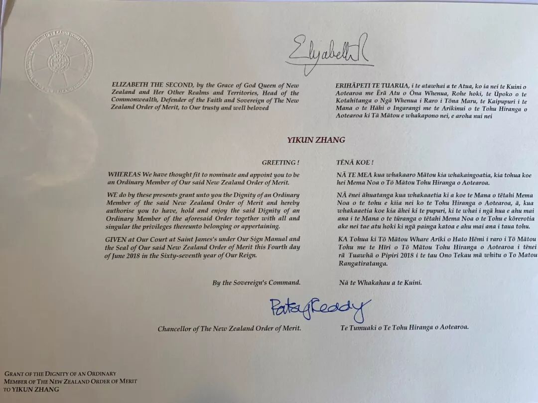 英女王伊丽莎白二世及新西兰总督签署的授勋证书: