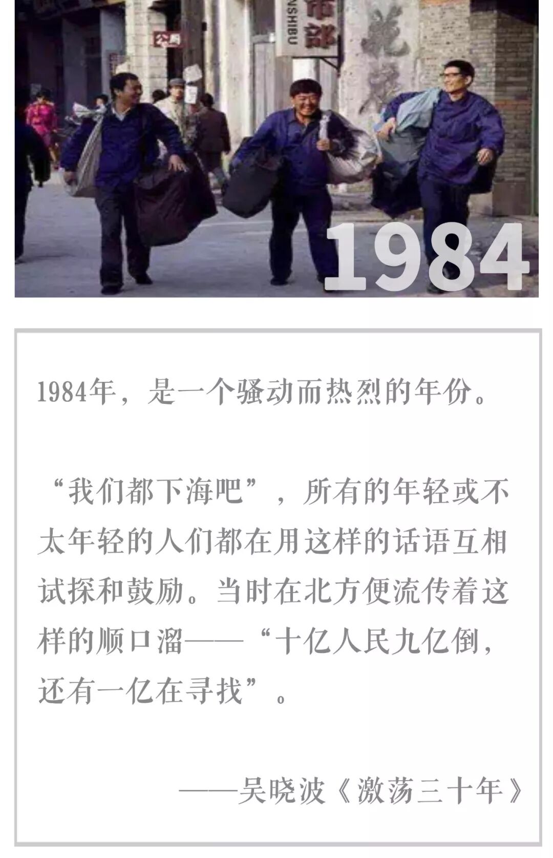 1984年初,一直坐镇北京的邓小平突然决定到南方看看,一路马不停蹄地走遍特区,一批青年人嗅到了不一样的味道,“干大事的时候到了”! 33岁的王石筹建了一个奇怪的公司,名叫“深圳现代科教仪器展销中心”。公司做了一个硕大的霓虹招牌,到了晚上,艳光四射,每个乘火车进出特区的旅客,都会多看几眼。4年后,这家公司更名为“万科”。