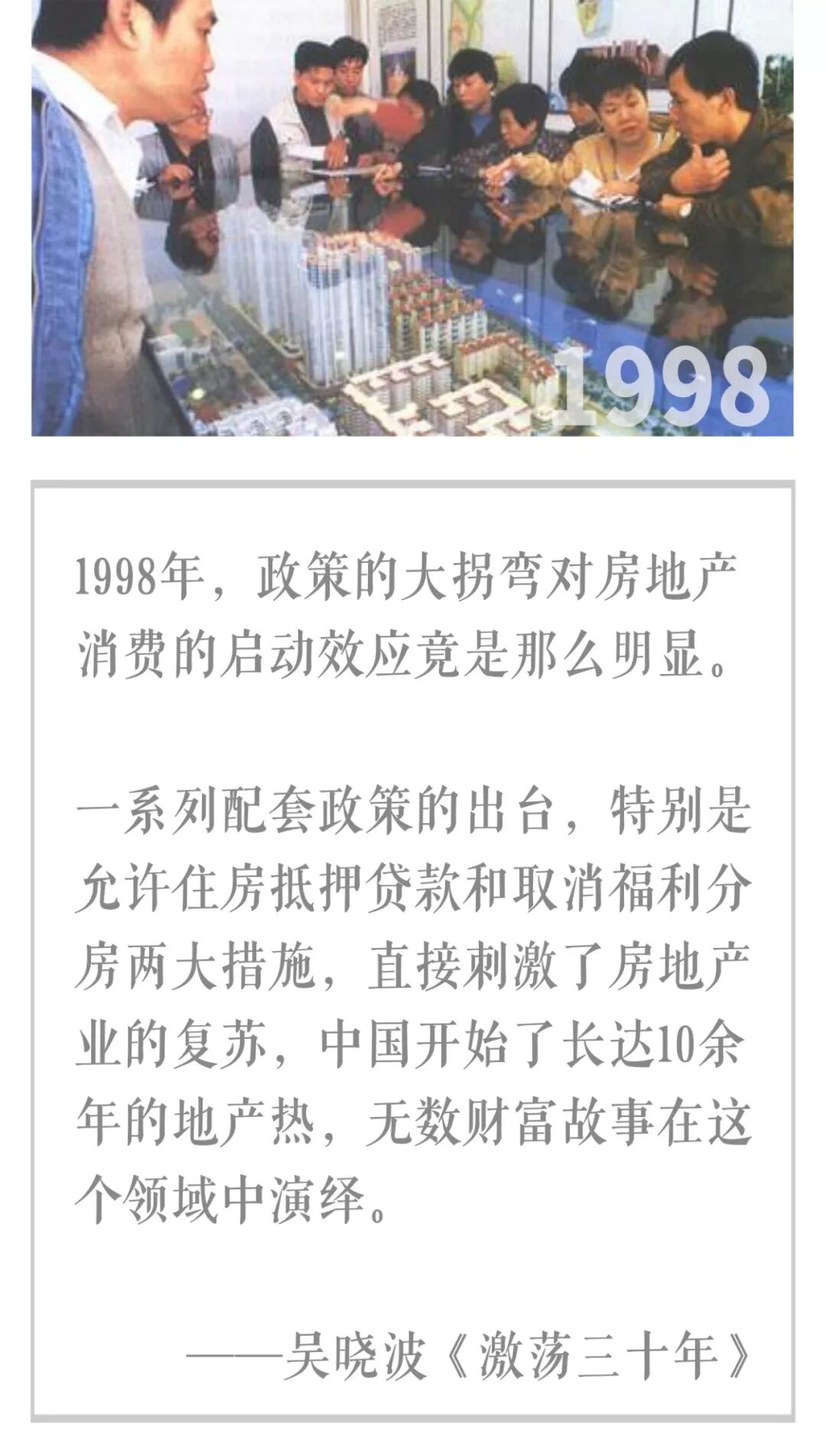 1998年,随着金融危机的蔓延,政府开始实施救市,宣布全面终止福利分房,开始货币化分配,新建住房原则上只售不租。 这一年,城市化率仅30%,农村收入不到城市的1/3,98房改开启了中国也是人类历史上最大规模的城乡居民迁徙进程,中国的城市化进入了快速发展的轨道,也带动了房价的一路上涨。