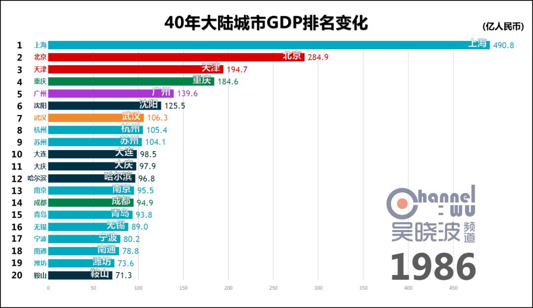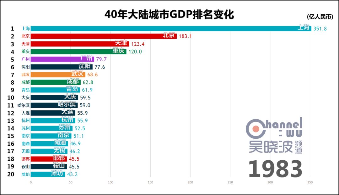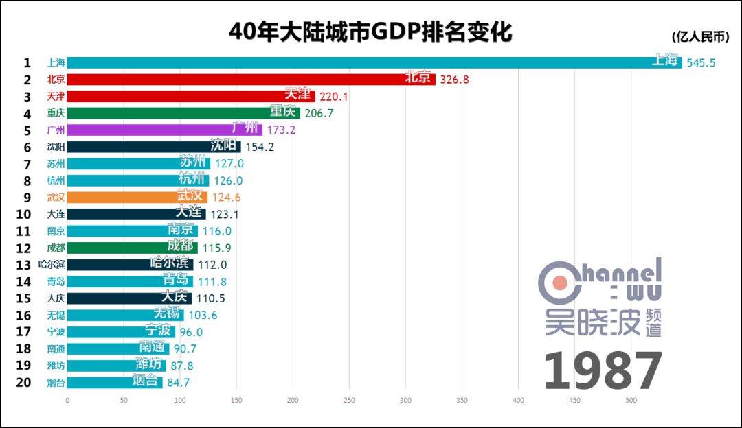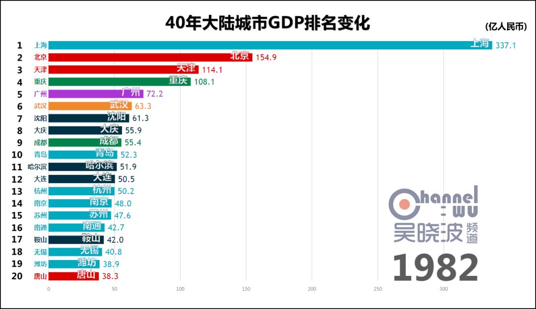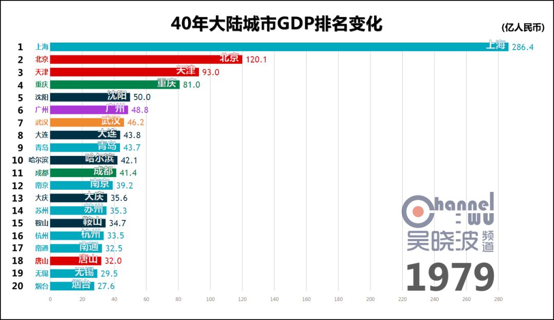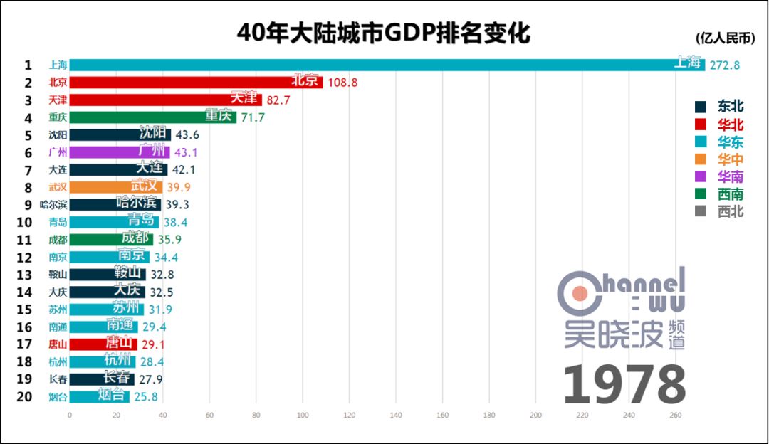1978年,改革开放元年,城市GDP第一名是上海。 这不足为奇,此后40年的第一都是上海,横贯于视频上方,俨然成为观察其他城市的尺度。 真正可怕之处在于,这一年的上海,GDP是第二名北京的2.5倍。或者这样说:不比较城市而比较省份,作为直辖市的上海仍然是全国第一。 如此悬殊的差距,为40年之最。(当然,改革开放前有悬殊更甚的时候) 除了上海,1978年也是东北的辉煌年代,沈阳、大连、哈尔滨、鞍山、大庆、长春6座城市进入前20名,其中前4座城市处于各自40年的最高排名上,这等盛况不复见于后日。 * 说明一下长春。由于我国在1990年代前,并未采用西方的国民经济核算体系,所以此前的GDP都是90年代后根据历史数据推算而出的。长春市目前尚未推算1979-1989年的GDP,这项工作预计在明年完成。或许这个时间段里长春仍有进入前20名的年份,但我们能确定的只有,1990年长春GDP再次“上线”的时候,已离前20名颇为遥远。 与其说这是上海和东北的辉煌,不如说其他城市还很稚嫩。此时的中国谈不上“均衡发展、多元发展”,甚至谈不上“发展”。 没关系,大家准备好,1978年12月,十一届三中全会召开。