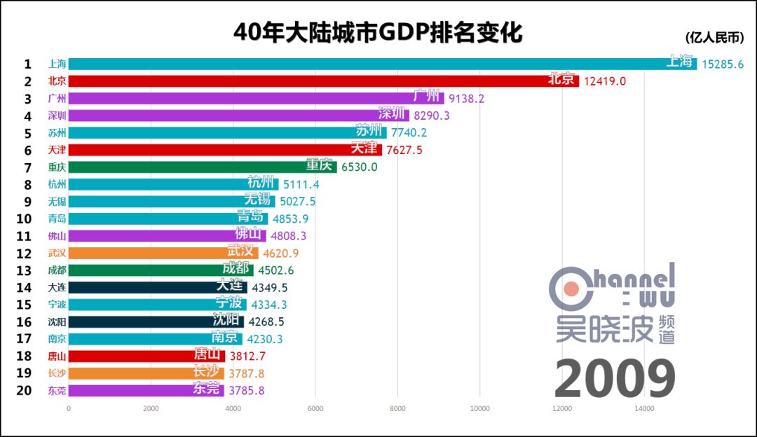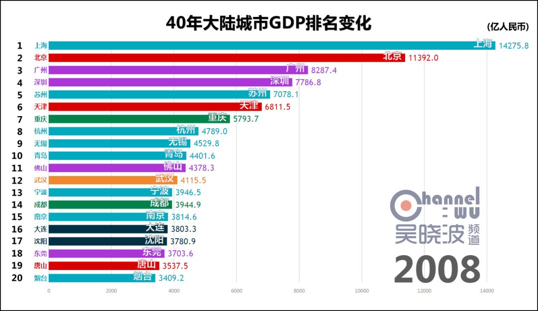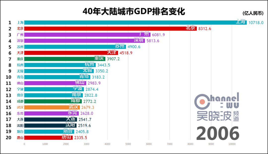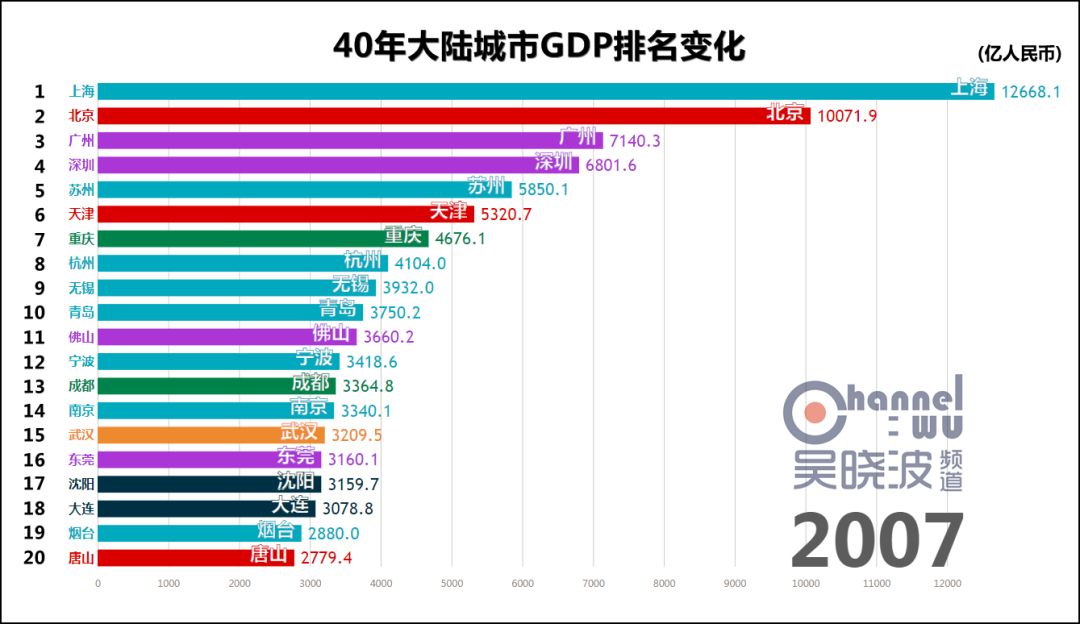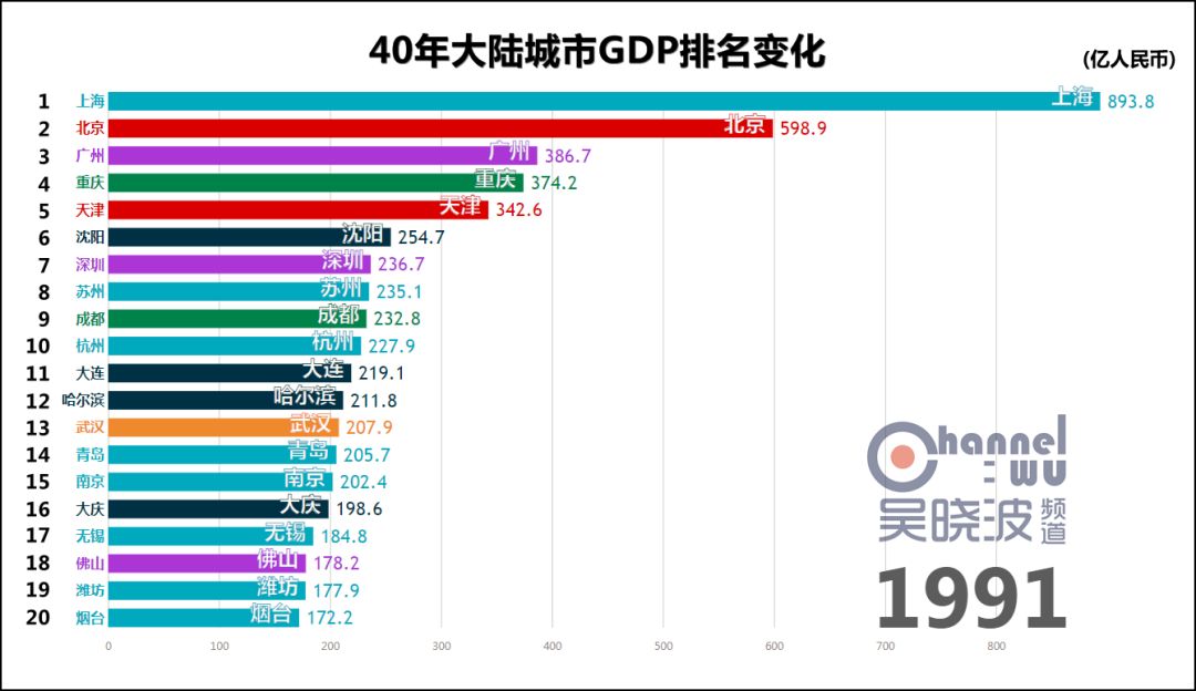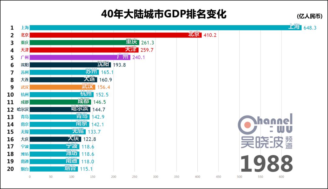 1978年,改革开放元年,城市GDP第一名是上海。 这不足为奇,此后40年的第一都是上海,横贯于视频上方,俨然成为观察其他城市的尺度。 真正可怕之处在于,这一年的上海,GDP是第二名北京的2.5倍。或者这样说:不比较城市而比较省份,作为直辖市的上海仍然是全国第一。 如此悬殊的差距,为40年之最。(当然,改革开放前有悬殊更甚的时候) 除了上海,1978年也是东北的辉煌年代,沈阳、大连、哈尔滨、鞍山、大庆、长春6座城市进入前20名,其中前4座城市处于各自40年的最高排名上,这等盛况不复见于后日。 * 说明一下长春。由于我国在1990年代前,并未采用西方的国民经济核算体系,所以此前的GDP都是90年代后根据历史数据推算而出的。长春市目前尚未推算1979-1989年的GDP,这项工作预计在明年完成。或许这个时间段里长春仍有进入前20名的年份,但我们能确定的只有,1990年长春GDP再次“上线”的时候,已离前20名颇为遥远。 与其说这是上海和东北的辉煌,不如说其他城市还很稚嫩。此时的中国谈不上“均衡发展、多元发展”,甚至谈不上“发展”。 没关系,大家准备好,1978年12月,十一届三中全会召开。