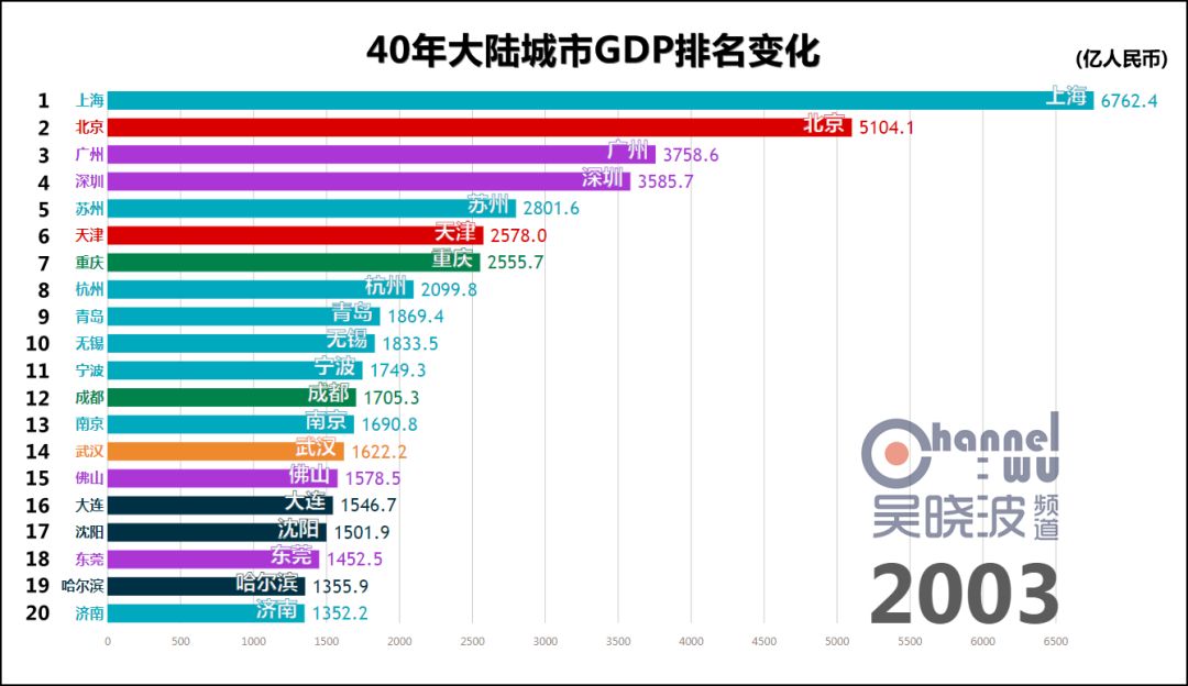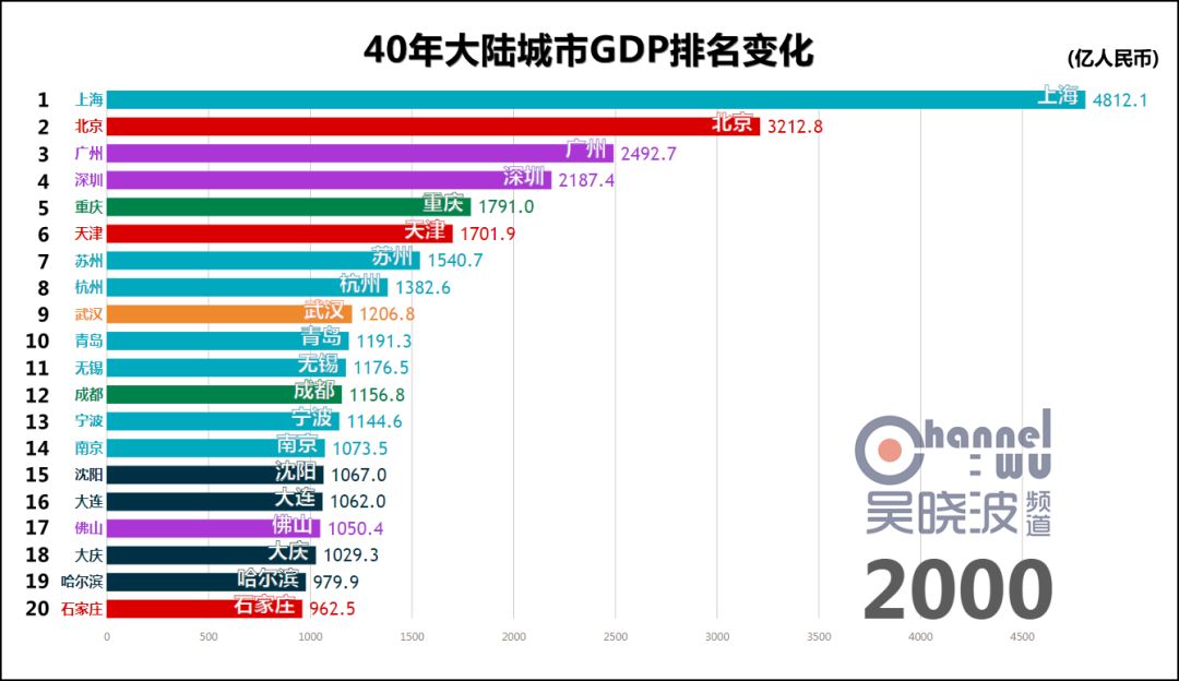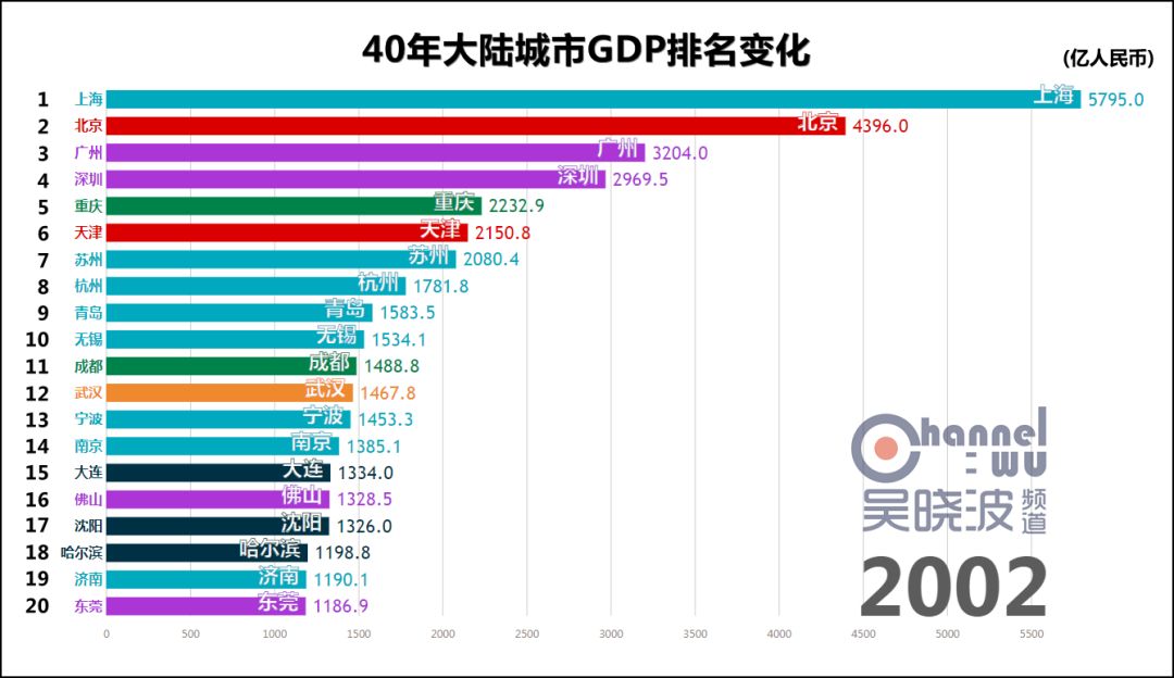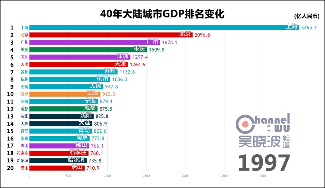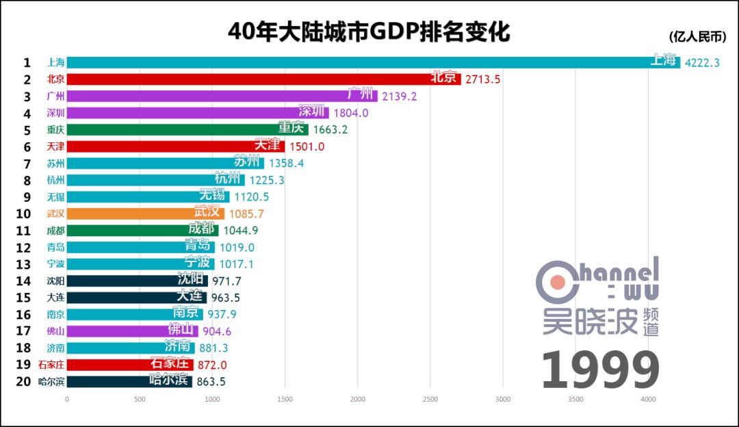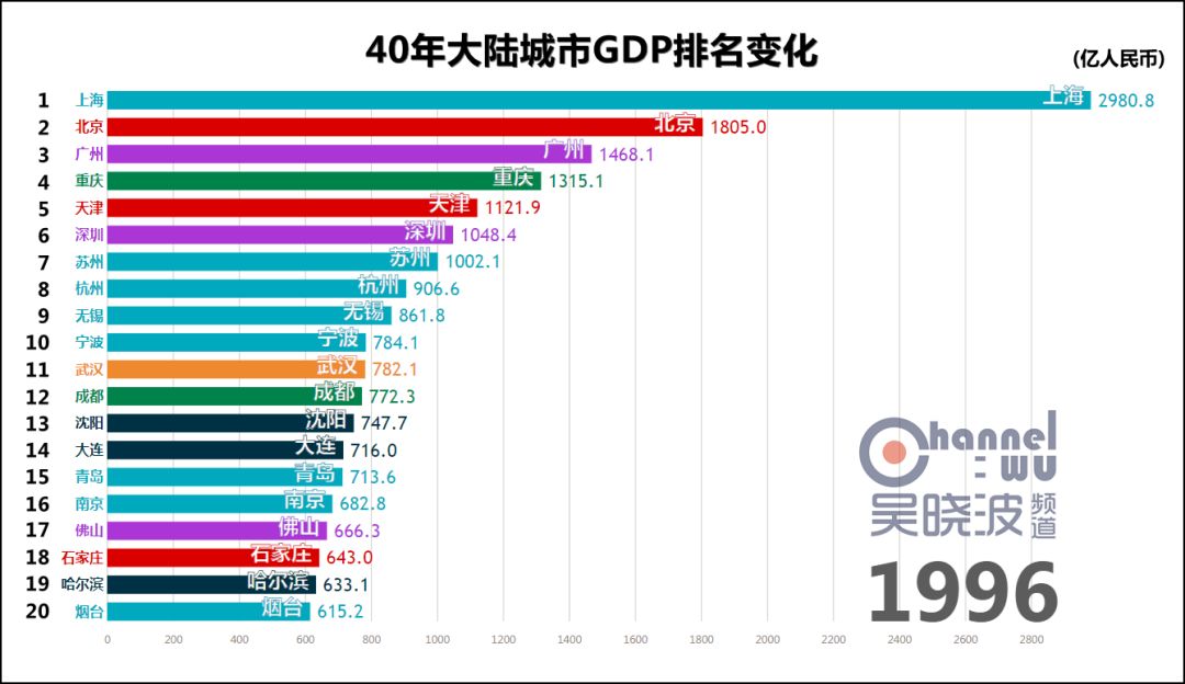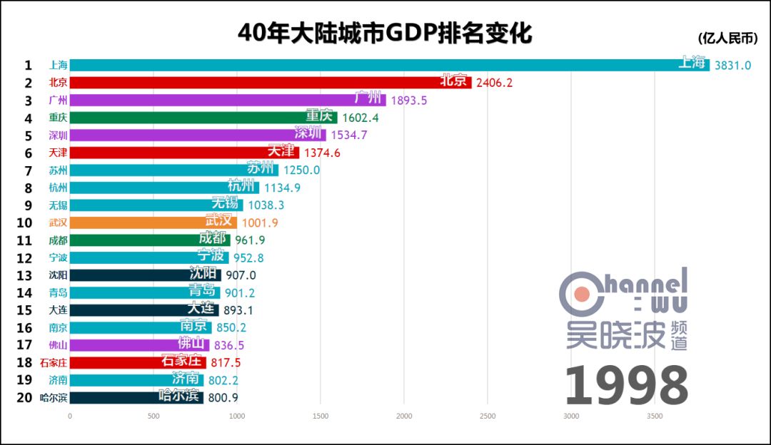 (1995-1996) 1995年,杭州触及40年最高排名——全国第8。 它在这个位次上稳坐了17年。 很多人认为直到近些年,阿里巴巴才成就了杭州,这也未免太小看这座民营经济重镇了。 1996年,宁波触及40年最高排名,进入全国前十。 考虑到当时宁波人口只有成都的一半,这个成绩相当惊人。 这一年,沪苏杭锡甬5座城市位居全国前十,可以说是长三角地区的高光时刻。 同年,石家庄上榜,华北地区难得在京津唐和曾经的邯郸之外又新增一座城市。 * 石家庄在地市合并后,截止目前尚未根据辖区变化调整1995年以前的GDP历史数据,因此可供横向对比的GDP数值只能从1996年开始。此前石家庄或许也在全国前20名内,亦未可知。