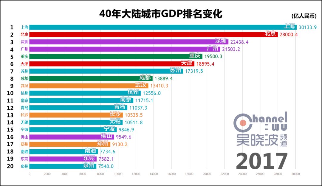 (2013-2017) 2013年的“一带一路”、2014年的京津冀协同发展、2016年的长江经济带三大国家战略,让更多城市迎来机会。 2017年,深圳超越广州,追平香港。 同年,泉州上榜,这是福建省第一次进入榜单。 同年,最令人惊喜的是南通,时隔28年重回全国前20。既然南通可以,其他地方凭什么不行? 此外,2017年的第21名是西安。随着西咸新区的划归,我们有理由期待2018年,排名里会多出一座西北城市。